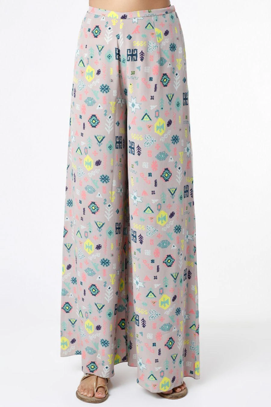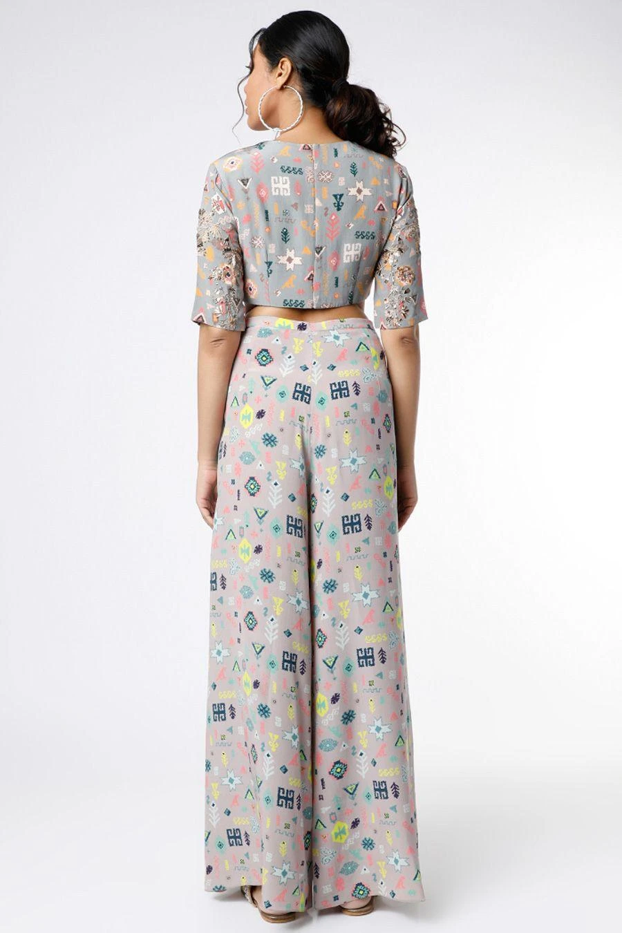 Contemporise your festive closet with this co-ord set. Crafted in crepe, this set comes with a kilim bandhani printed & embroidered choli with lavender palazzo pants. Style this set with a pair of dangler earrings & a clutch to complete the look.
