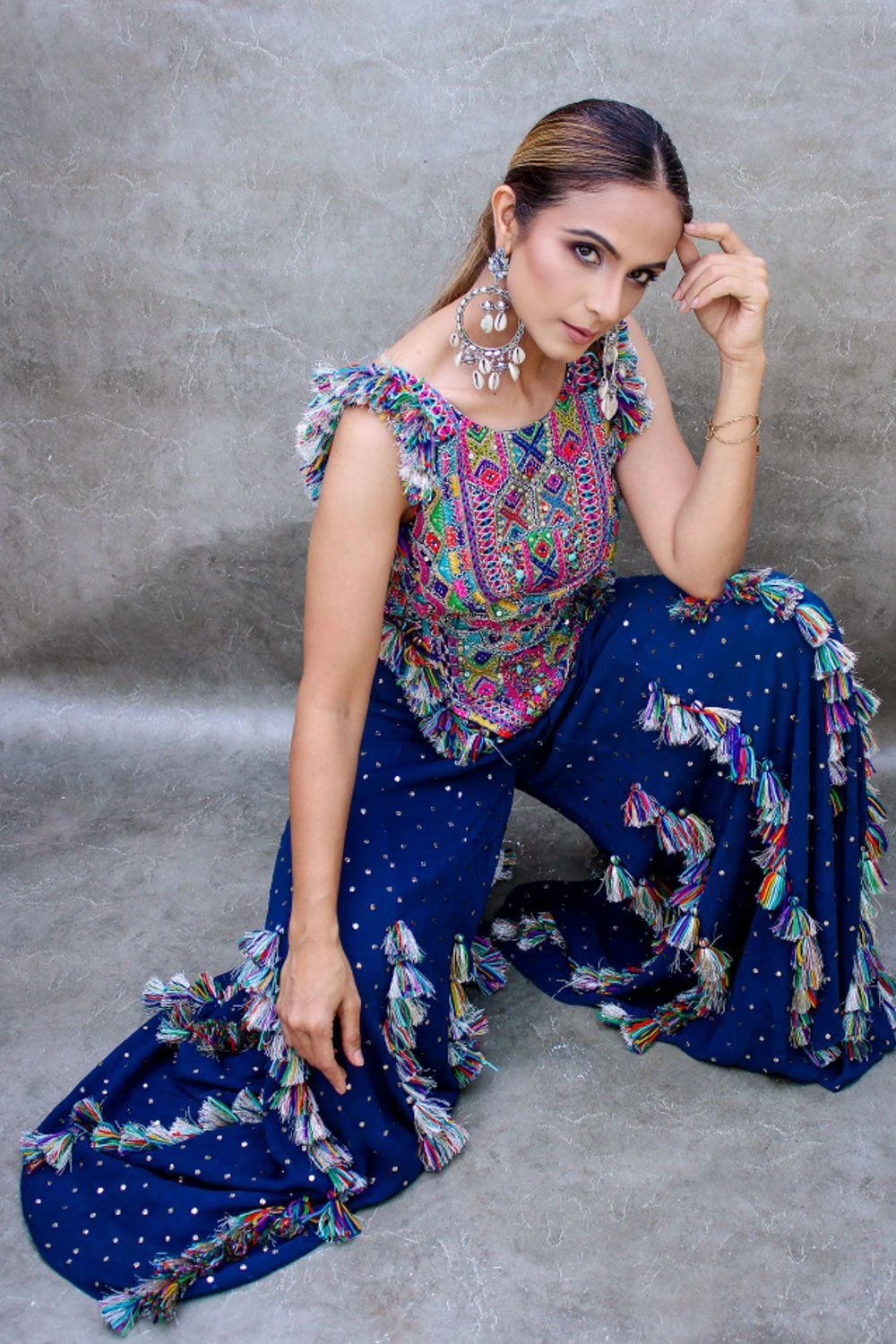 Contemporise your festive closet with this midnight blue sharara set. It features Payal Singhal’s signature backless choli with extensive bohemian embroidery and a mukaish georgette sharara.