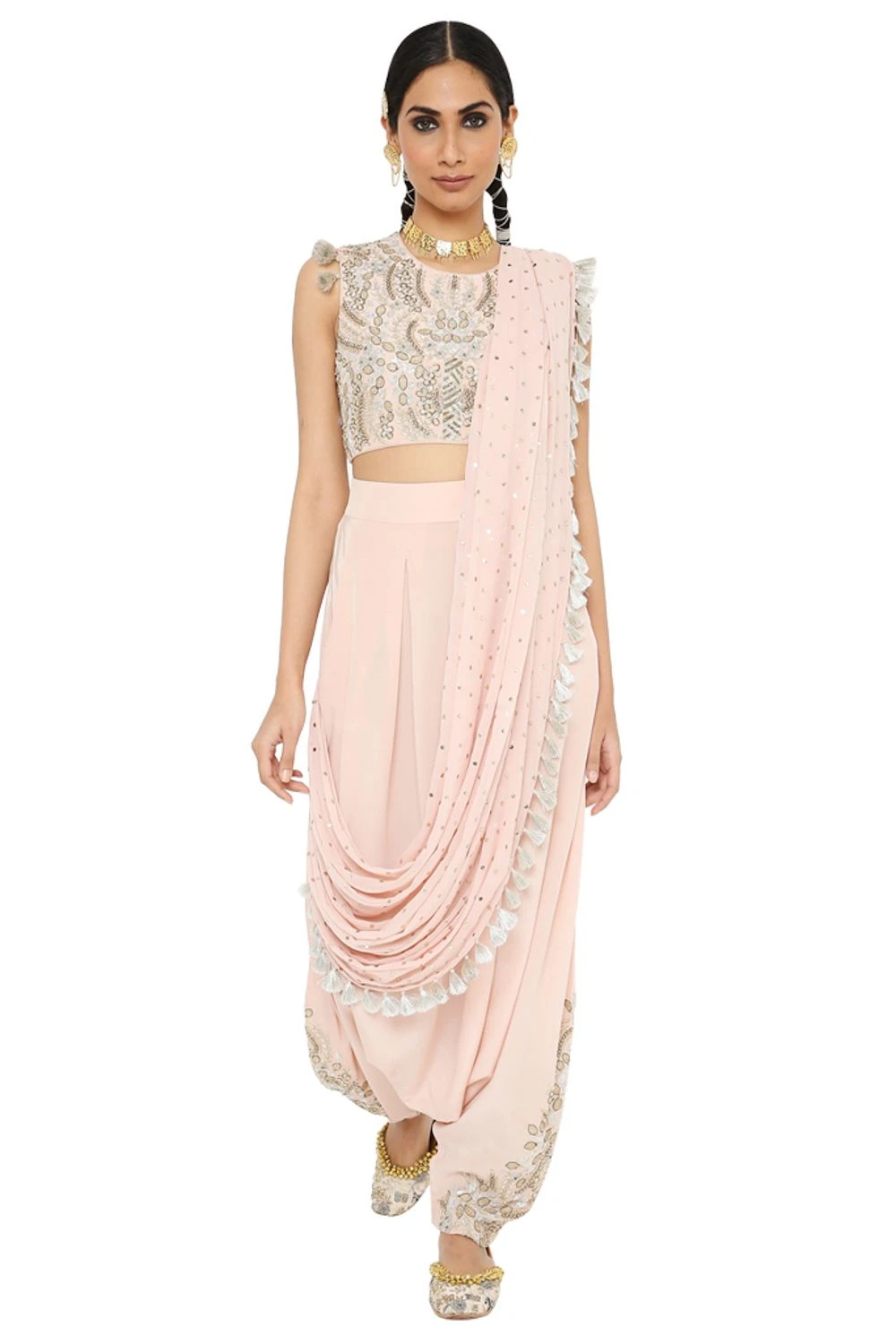 This stylish rose pink embroidered concept sari comes with an embroidered crepe choli, dhoti & a georgette mukaish drape. Style this chic set with statement earrings & a clutch for daytime summer wedding festivities.