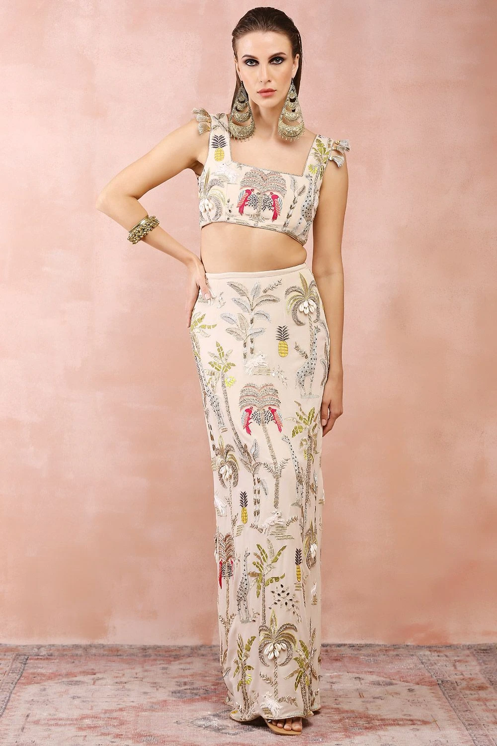 Indulge in the epitome of elegance with this embroidered choli. The intricate embroidery exudes timeless charm. Paired with a fitted skirt featuring safari-inspired embroidery, this ensemble is a perfect blend of luxury and style.