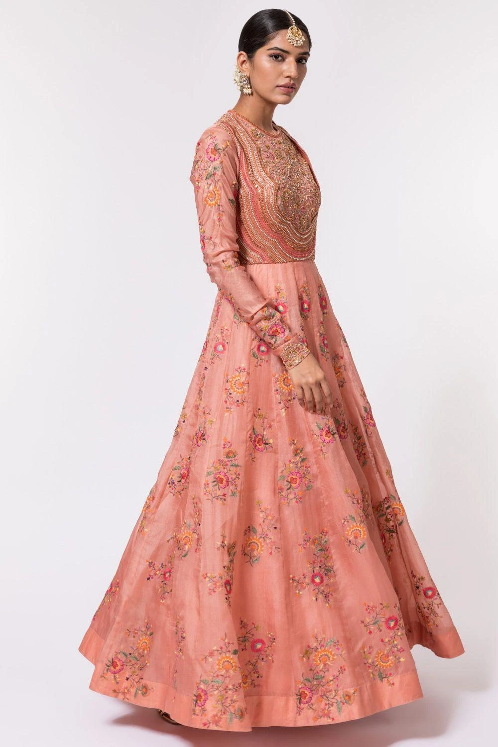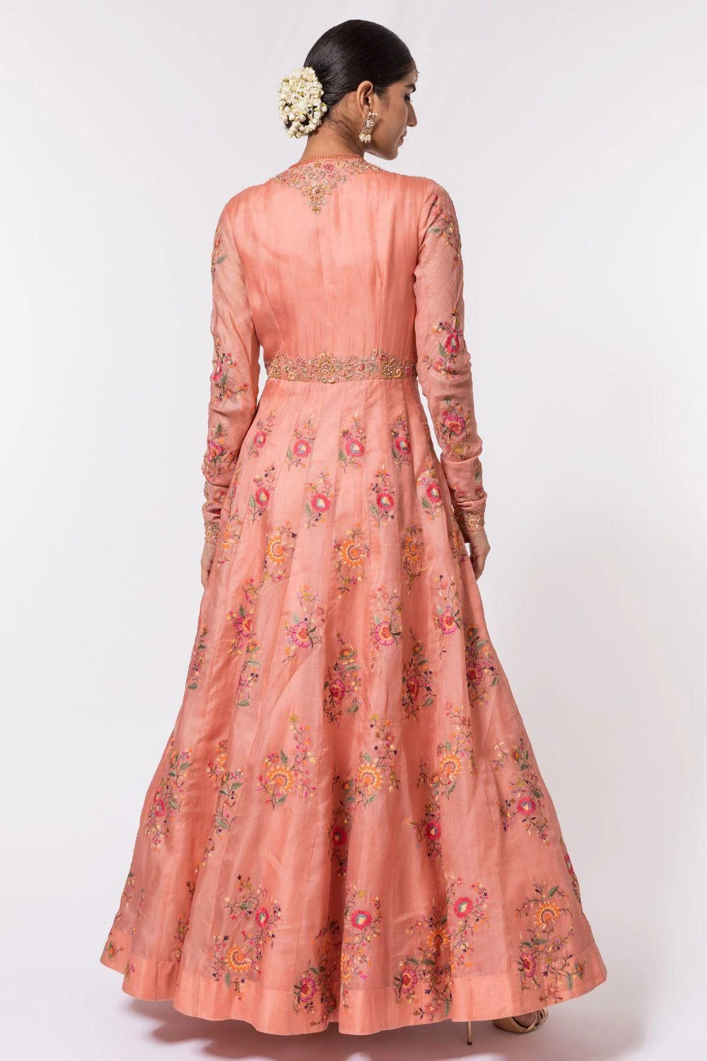 Radiate absolute spendour in this peach embroidered anarkali. It features a chanderi yoke with extravagant embroidery details, flowing down into a beautiful silk organza skirt. Style it with a pair of polki earrings for a daytime festivity.