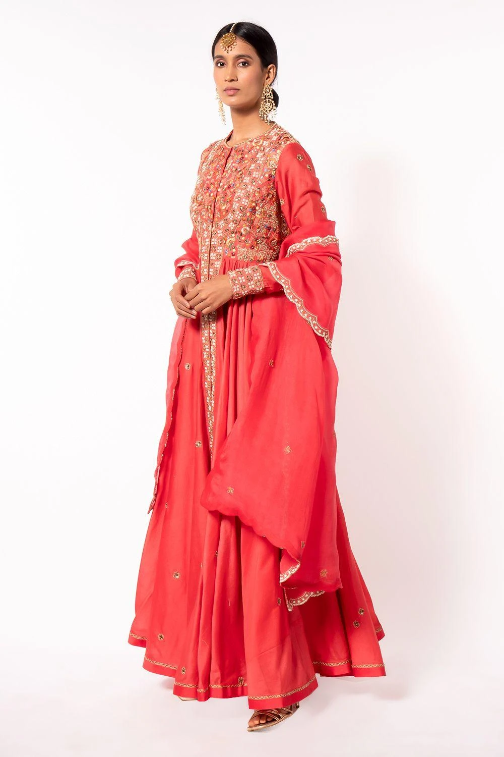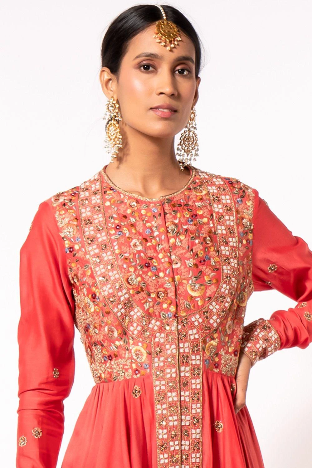 Exude sheer splendour & elegance in this anarkali set. It is made in luxe chanderi and enhanced with delicate hand and machine embroidery. It is complimented with a dupatta which adds an extra charm to this ensemble.