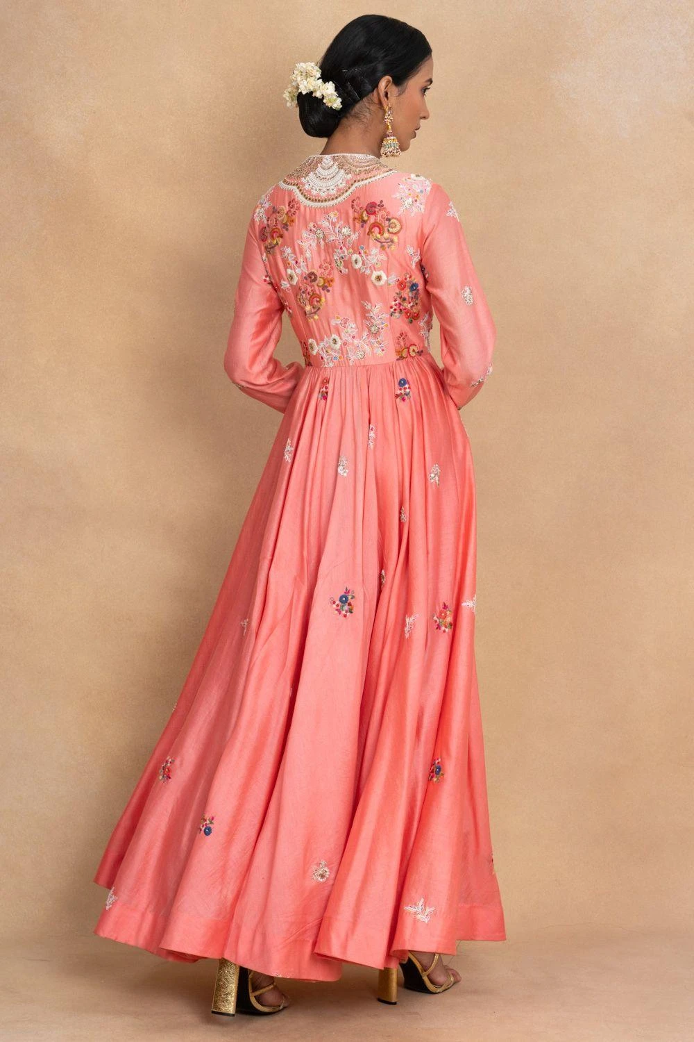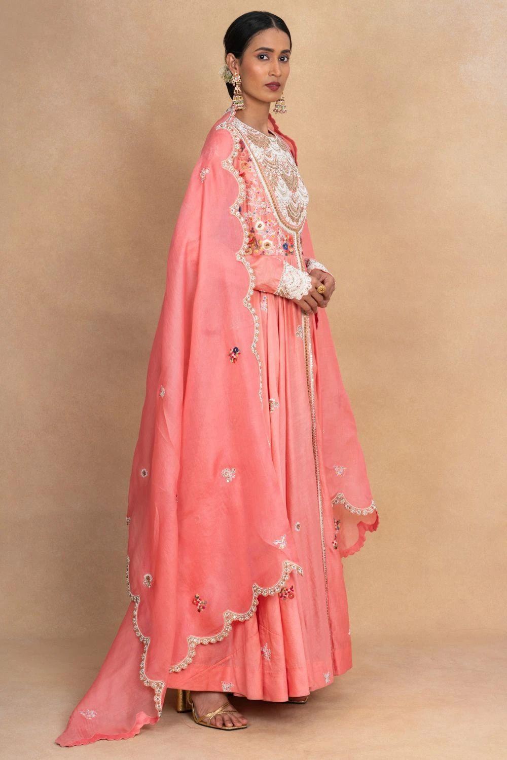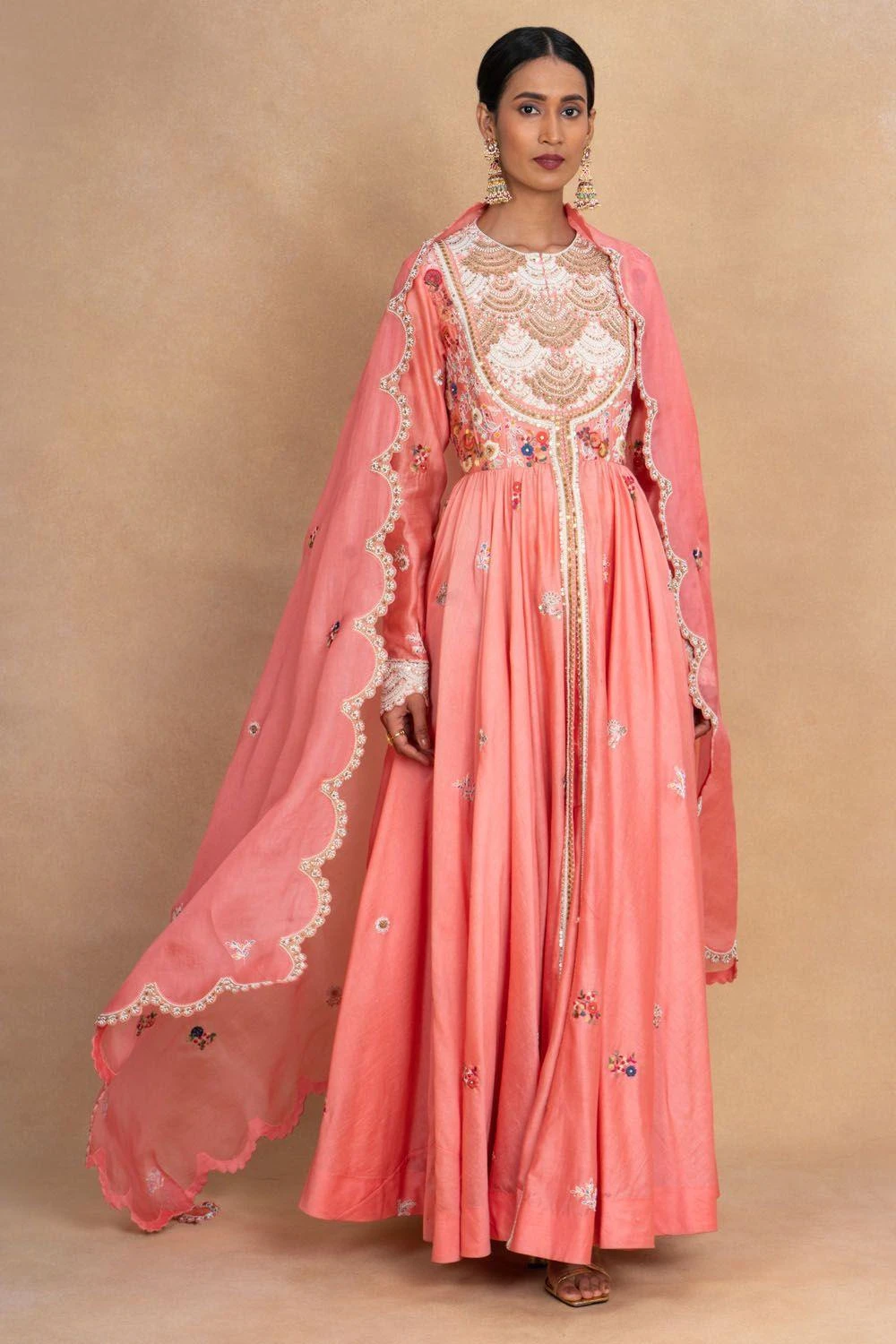 Indulge in ethereal beauty with this salmon pink floral kalidar set. This enchanting ensemble exudes grace and charm, adorned with delicate floral patterns. this kalidar kurta is paired with coordinating pants and a floral dupatta.