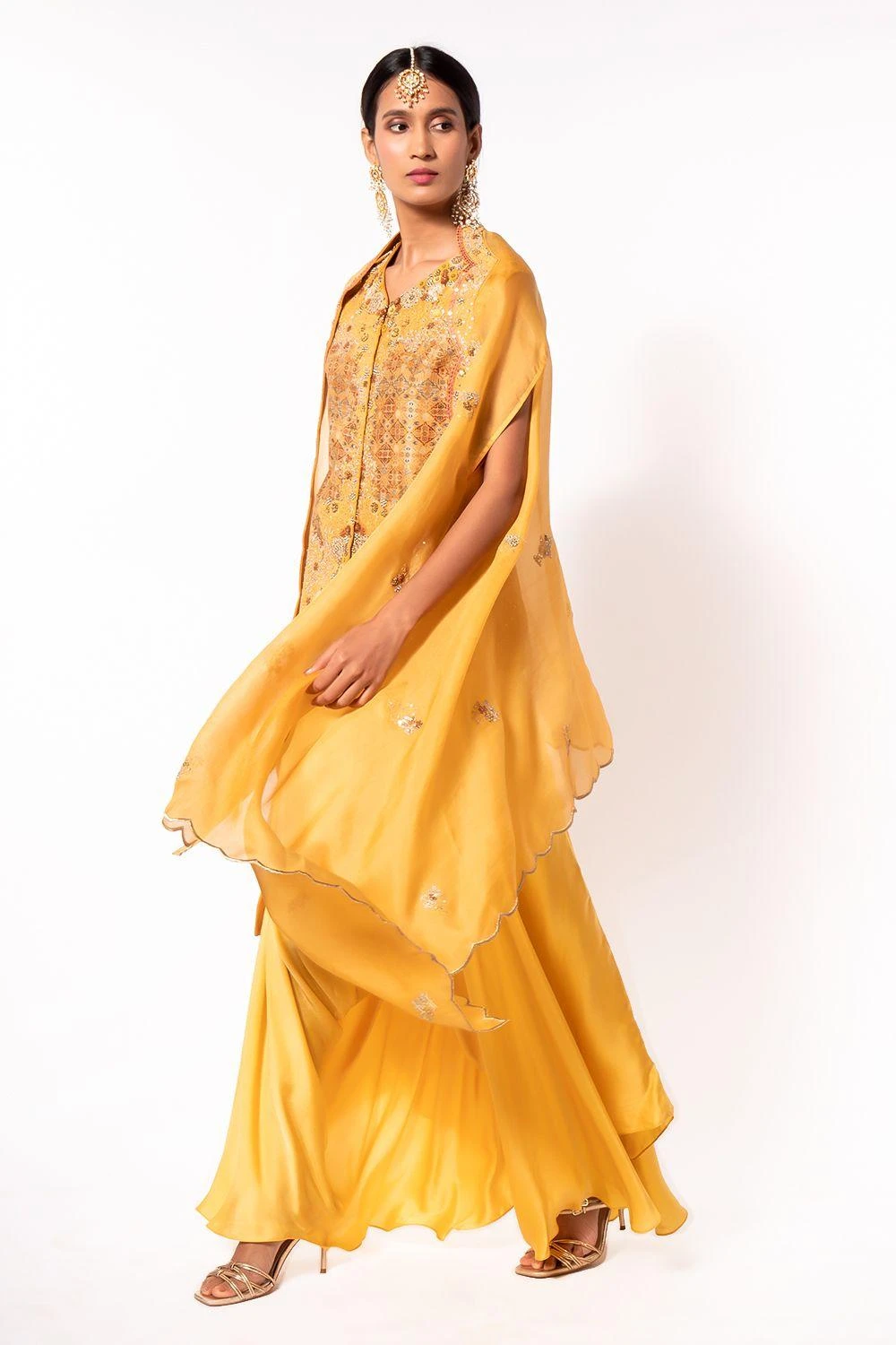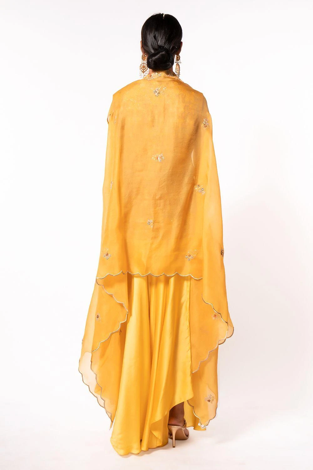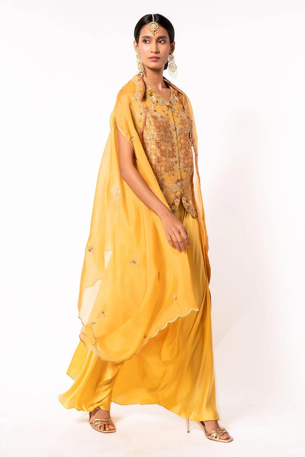 Take your festive style quotient a notch higher with this yellow fusion ensemble. It features a fully embroidered jacket, paired with low crotch drape pants and an embroidered cape.