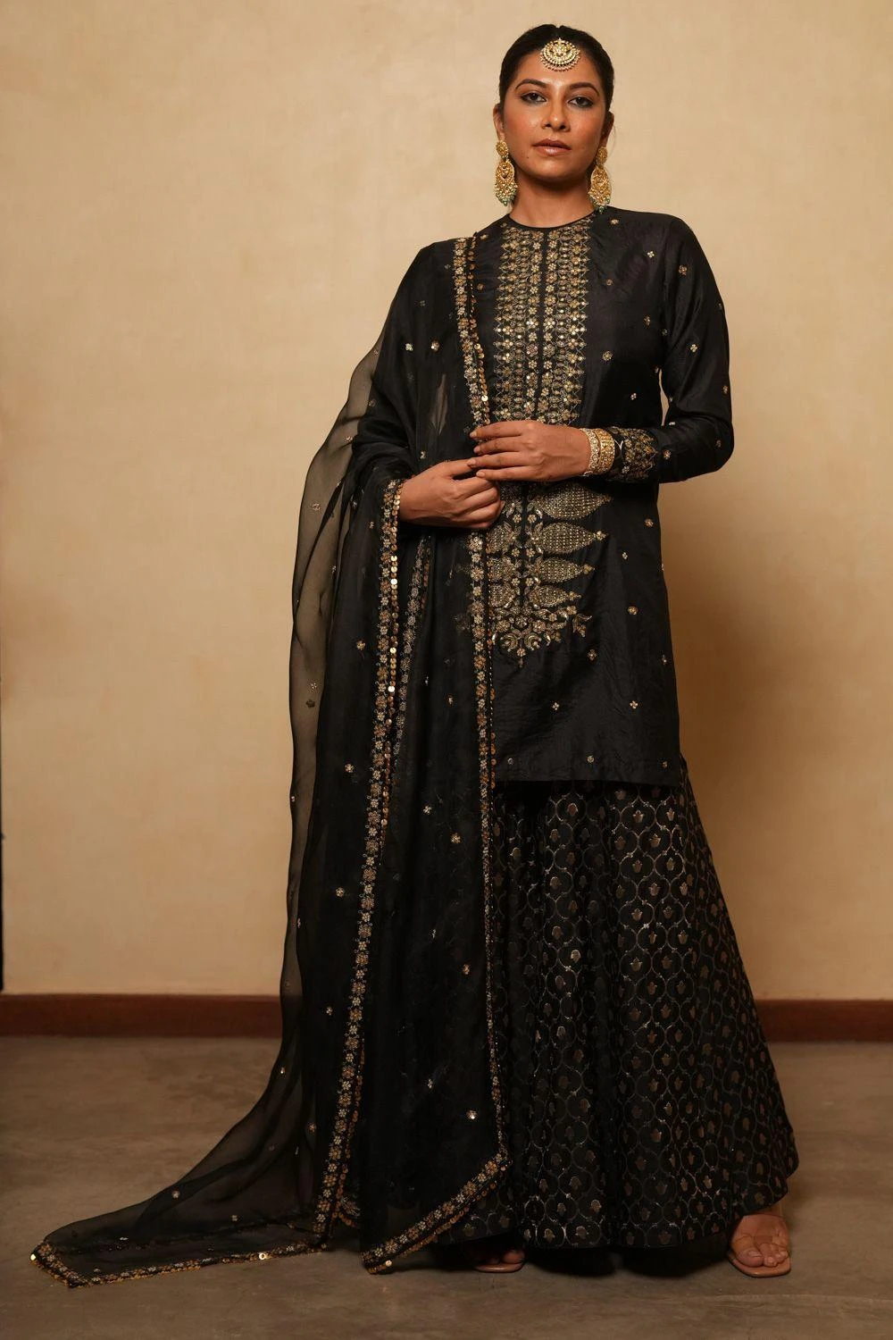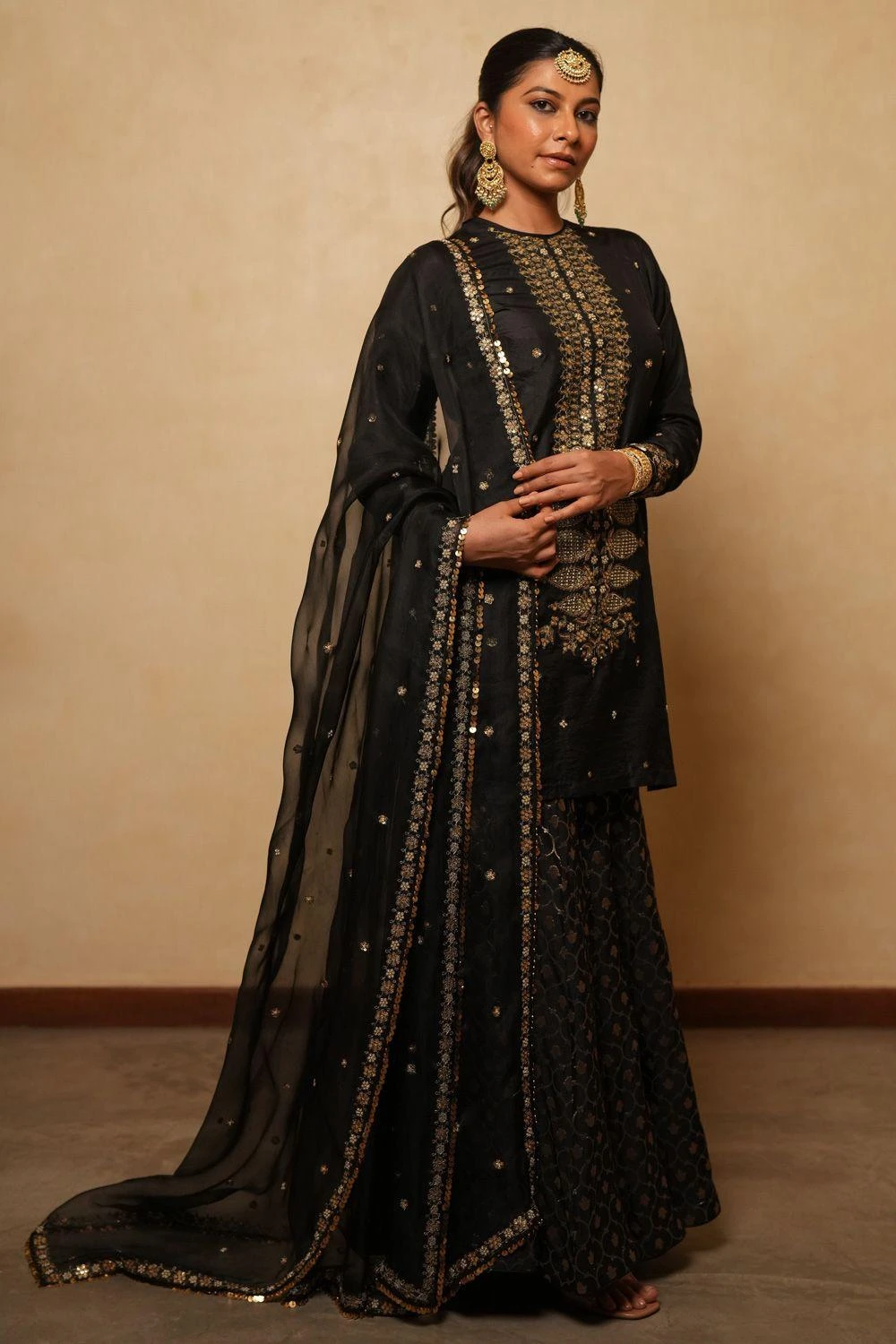 Enhance your elegance with the Black Organza Dupatta, a versatile accessory that effortlessly elevates any ensemble. Pair it with the black embellished sharara set from the collection to complete the set.
