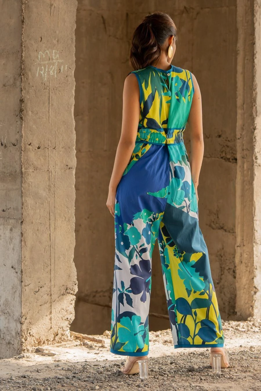 Add a layer of statement and glamour to your resort getaways with this blue jumpsuit. Crafted in cotton satin, this jumpsuit features a bold and vibrant abstract print all over. Add a pair of dangler earrings to complete the look.