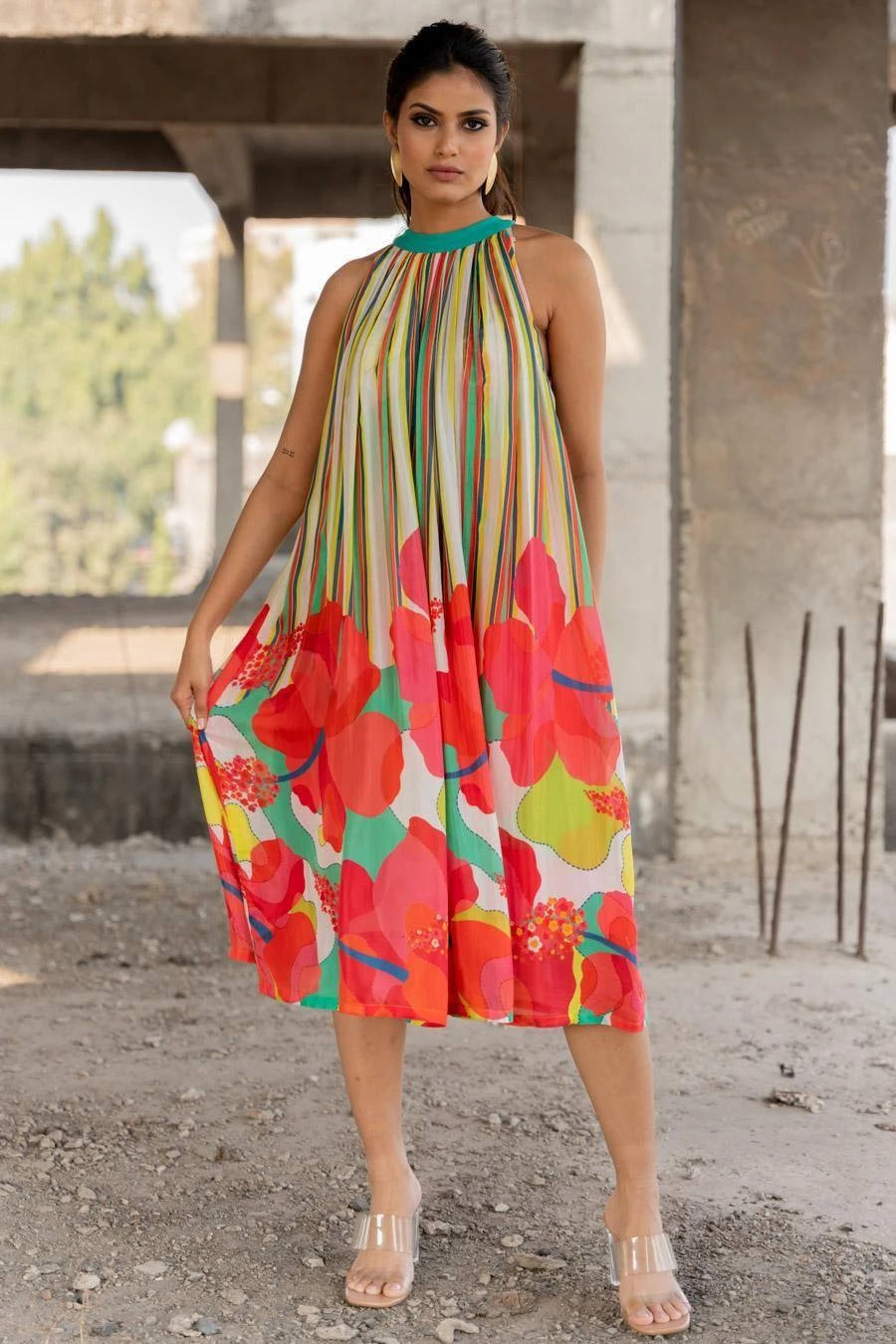 Add a layer of statement and glamour to your resort getaways with this multicoloured dress. Crafted in voil silk, this dress features a bold and vibrant abstract print all over. Add a pair of dangler earrings to complete the look.