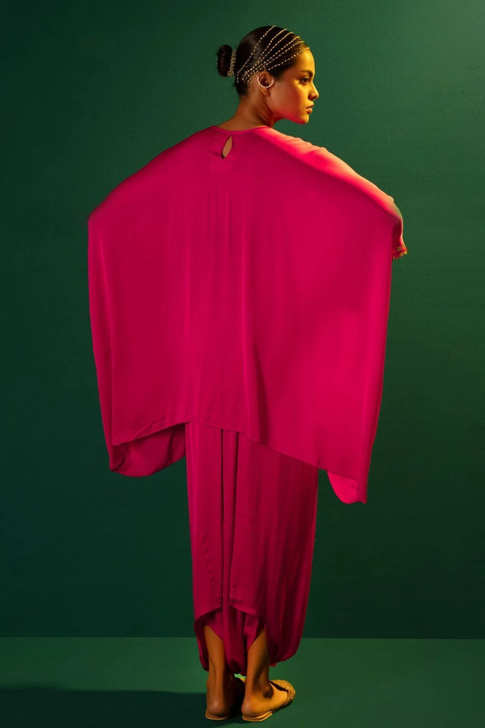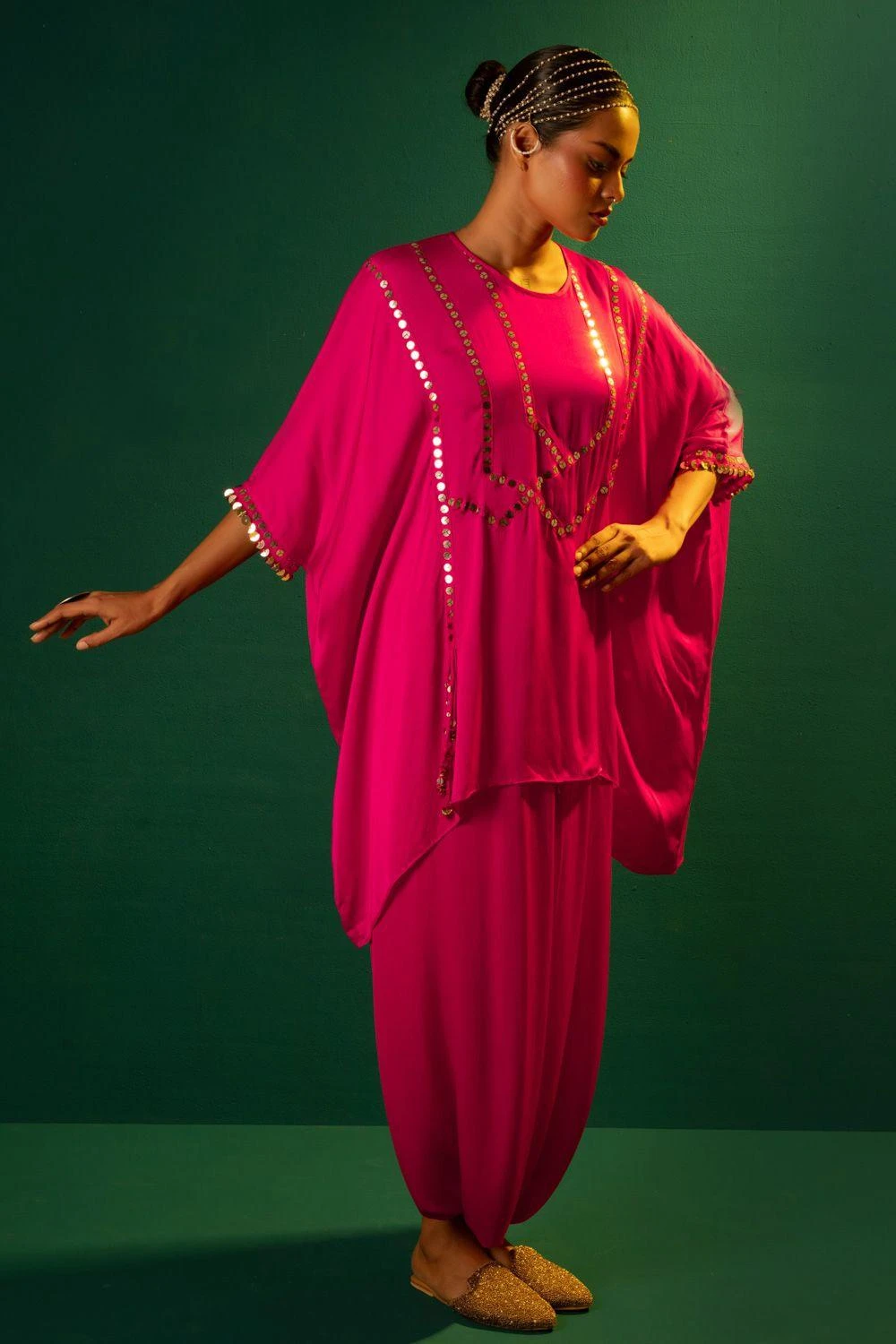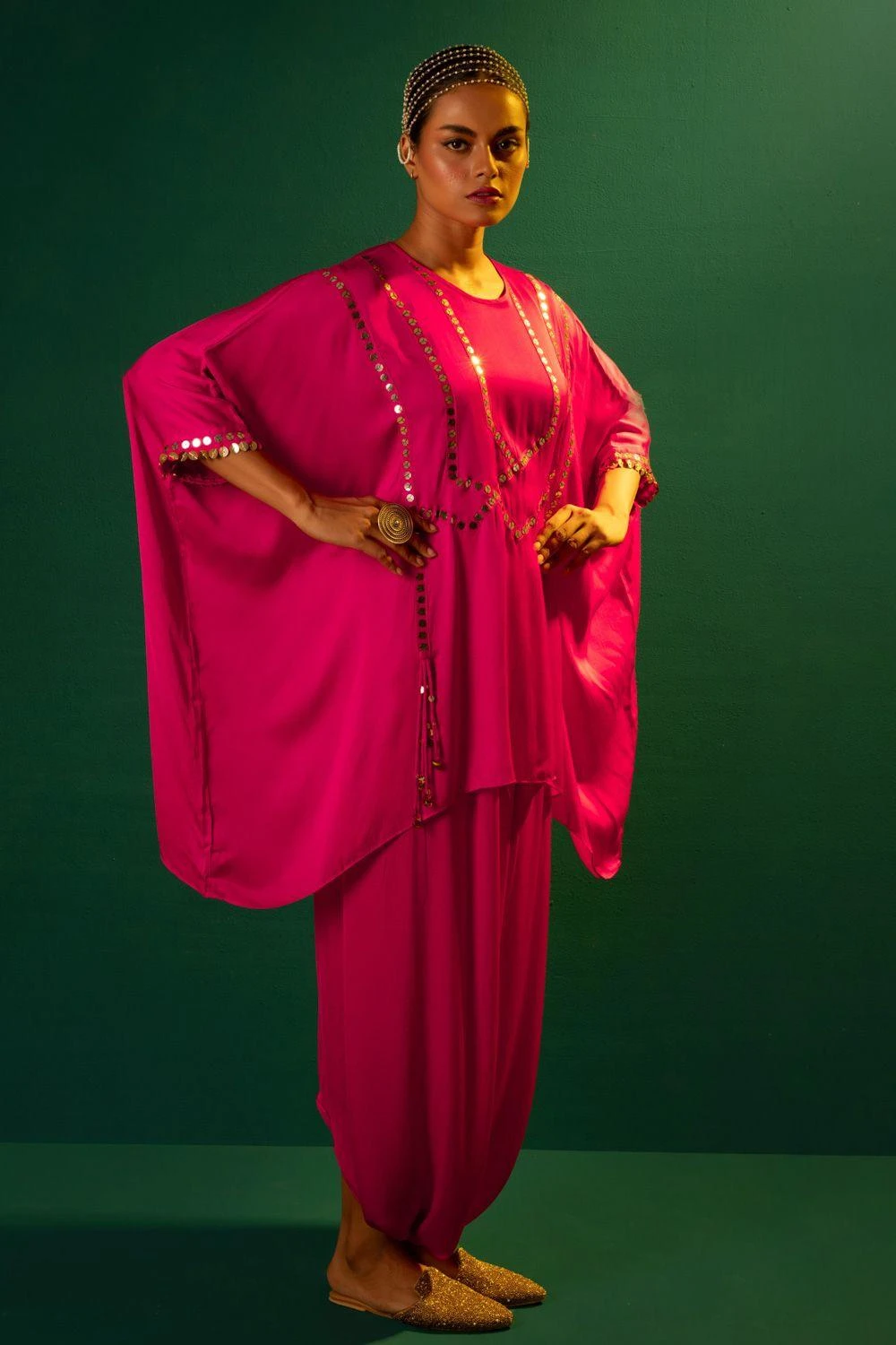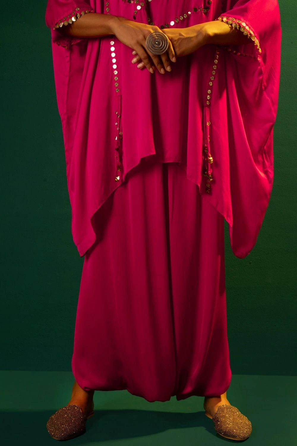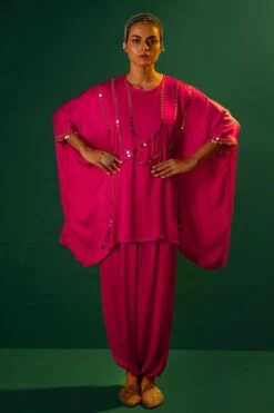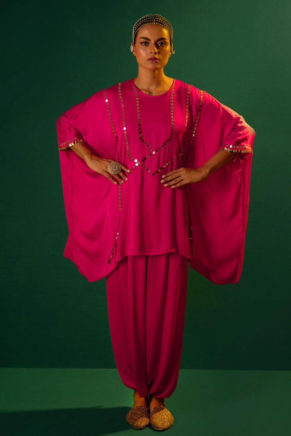 Elevate your style with this French Fuscia satin antifit tunic co-ord set, a fusion of contemporary design and Yemeni tradition. The top boasts hand-embroidered lace adorned with mirror-like sequins, creating a stunning ensemble that captivates.