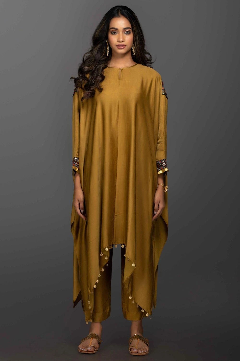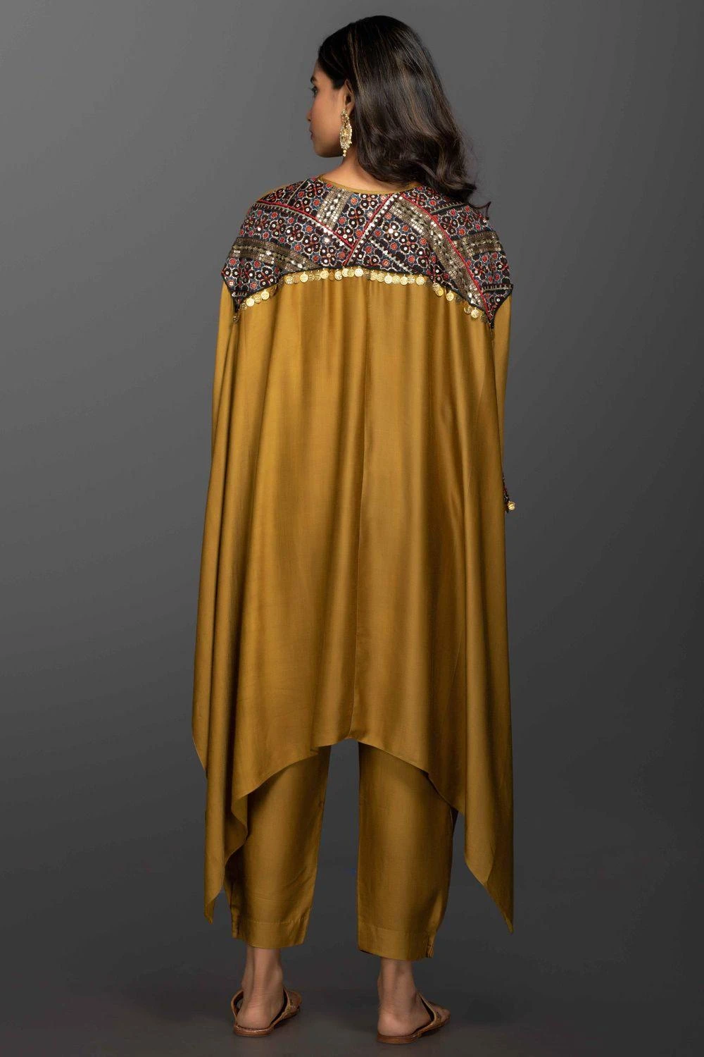 This gold mustard kurta set is the perfect outfit for the festivities. It is cut in satin silk and hand embroidered with ajrakh patch work at the back, adding a boho touch to this look. It comes with a pair of ankle length fitted pants.