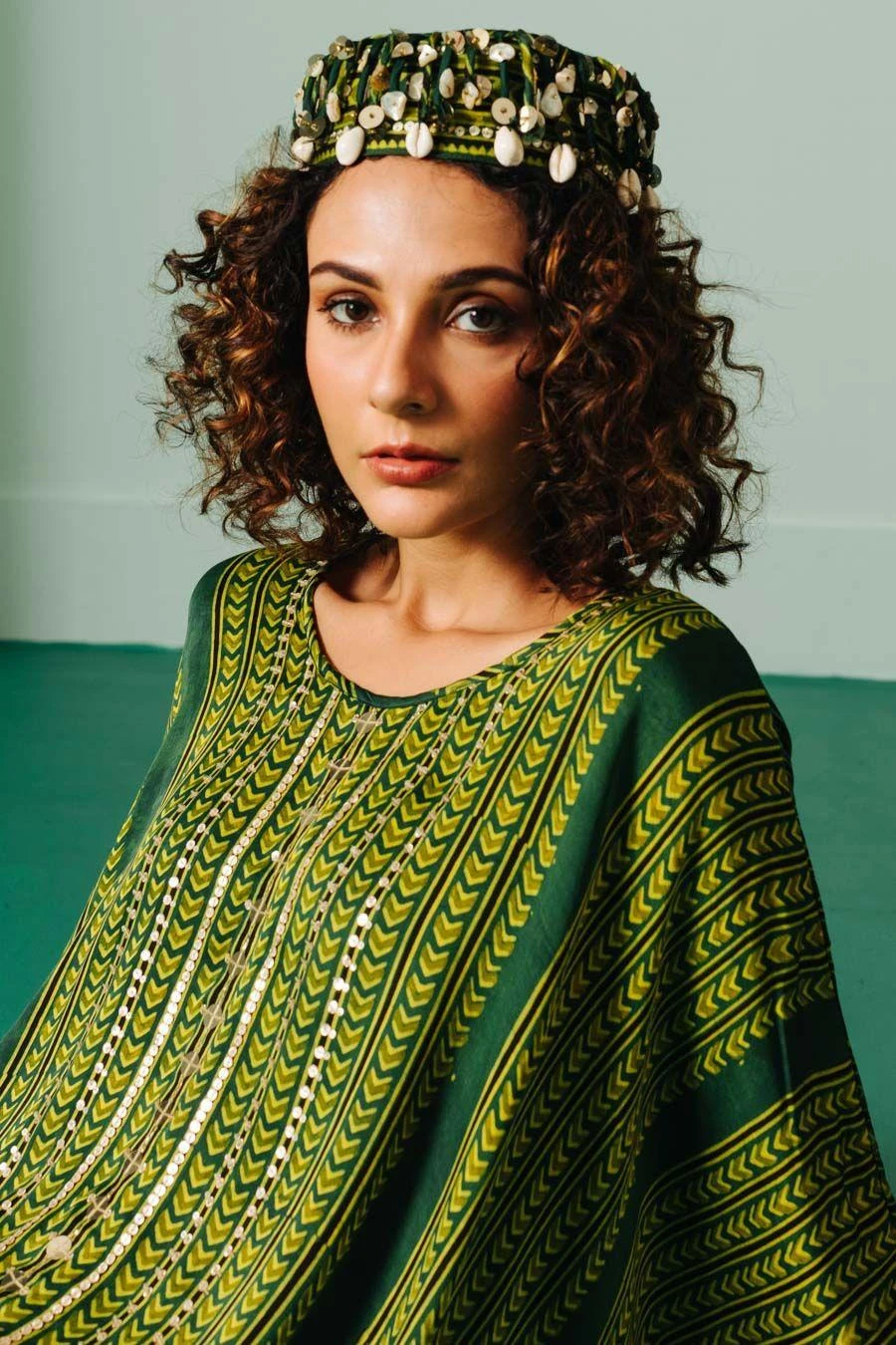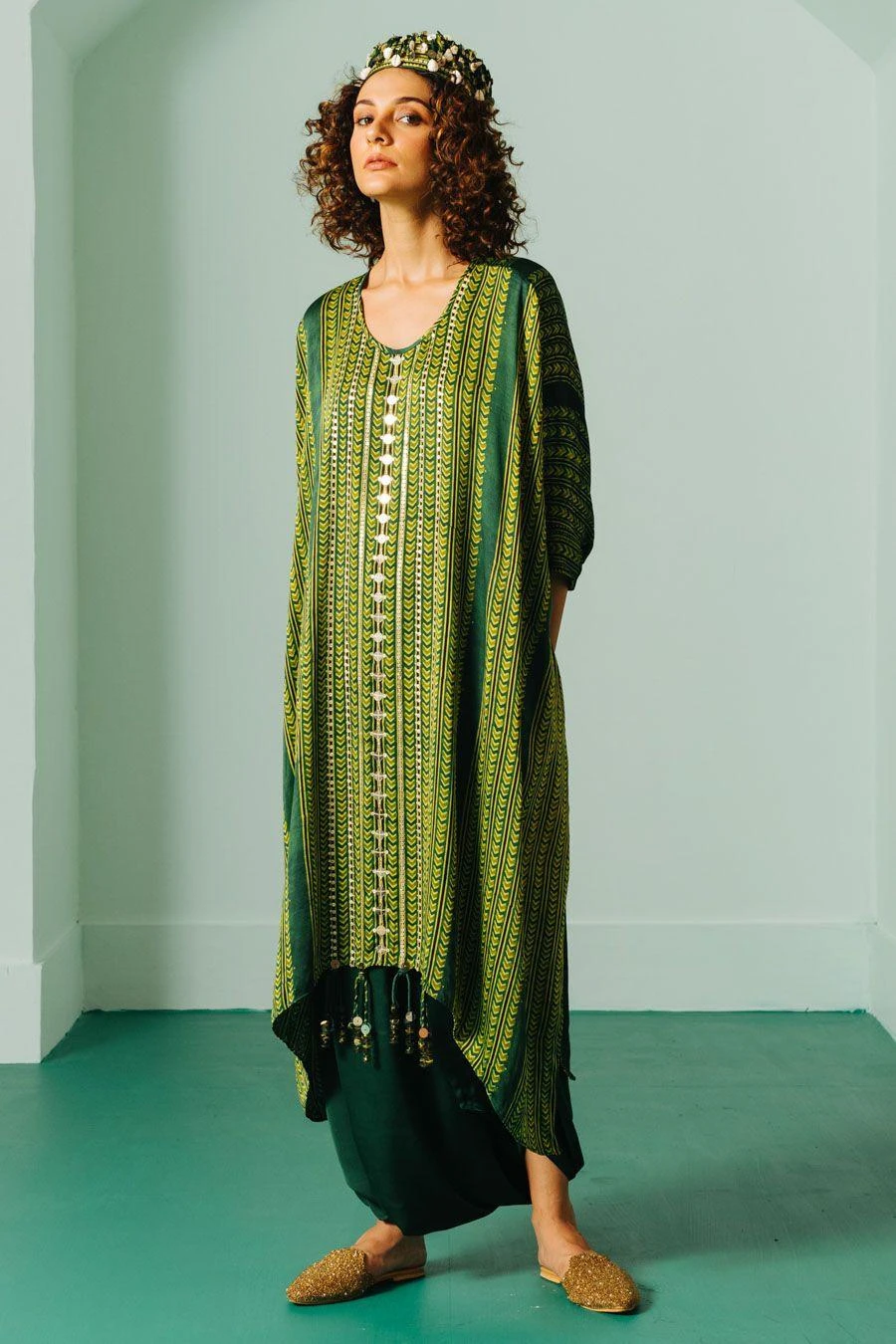 Handcrafted with the utmost care, and adorned with delicate light gold sequin and zari thread handwork, this ensemble features an asymmetric kaftan in pure ajrakh satin paired with a dhoti skirt.