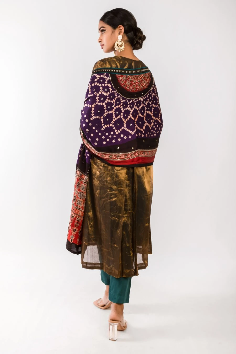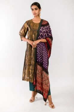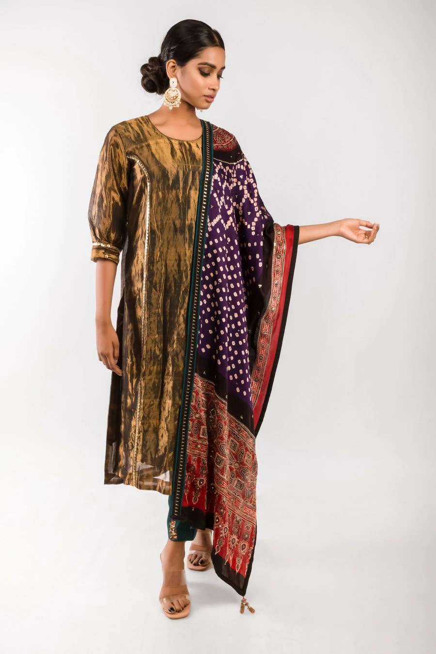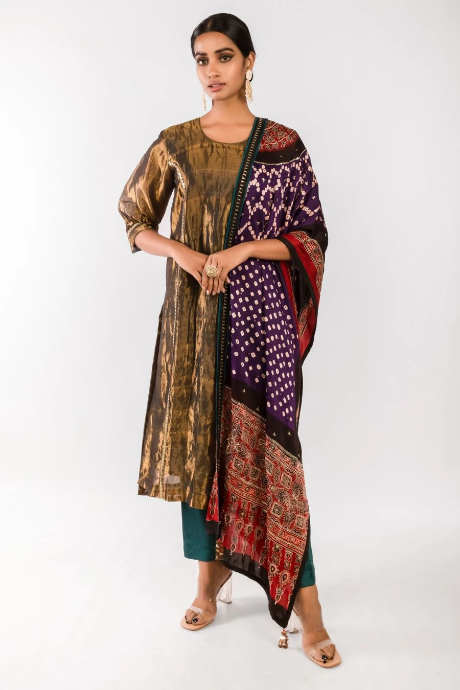 The perfect amalgamation of style and comfort, this kurta set works across occasions. Crafted in silk, this set features a hand embroidered kurta in handwoven gold zari with a dupatta in hand crafted bandhej ajrakh and slim fit pants.
