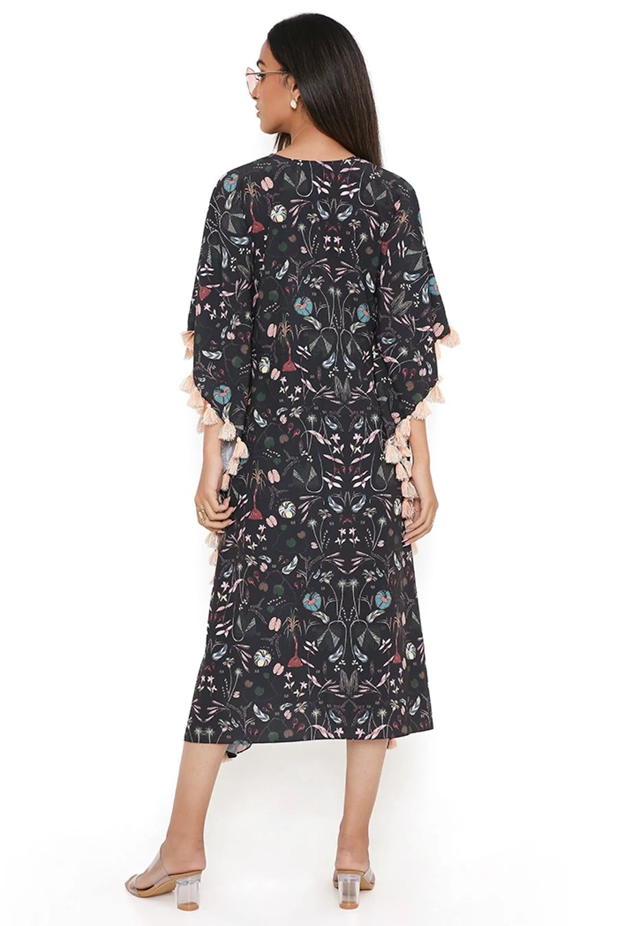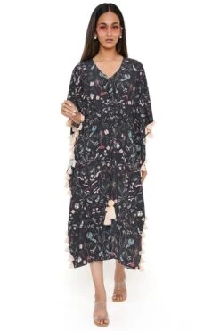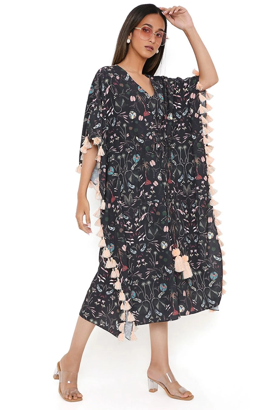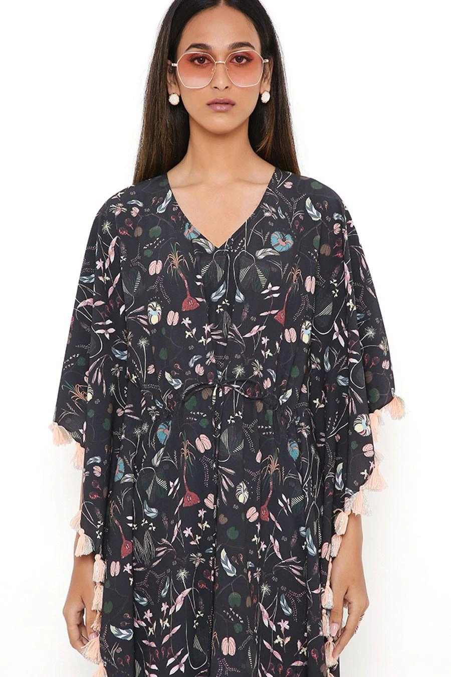 The perfect amalgamation of style and comfort, this kaftan is perfect for a day out. Crafted in art crepe, this dress features a floral print will tassels. Add a pair of dainty earrings to complete the look.