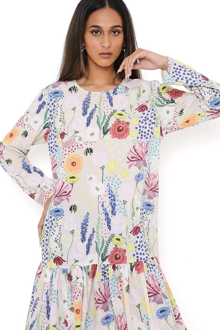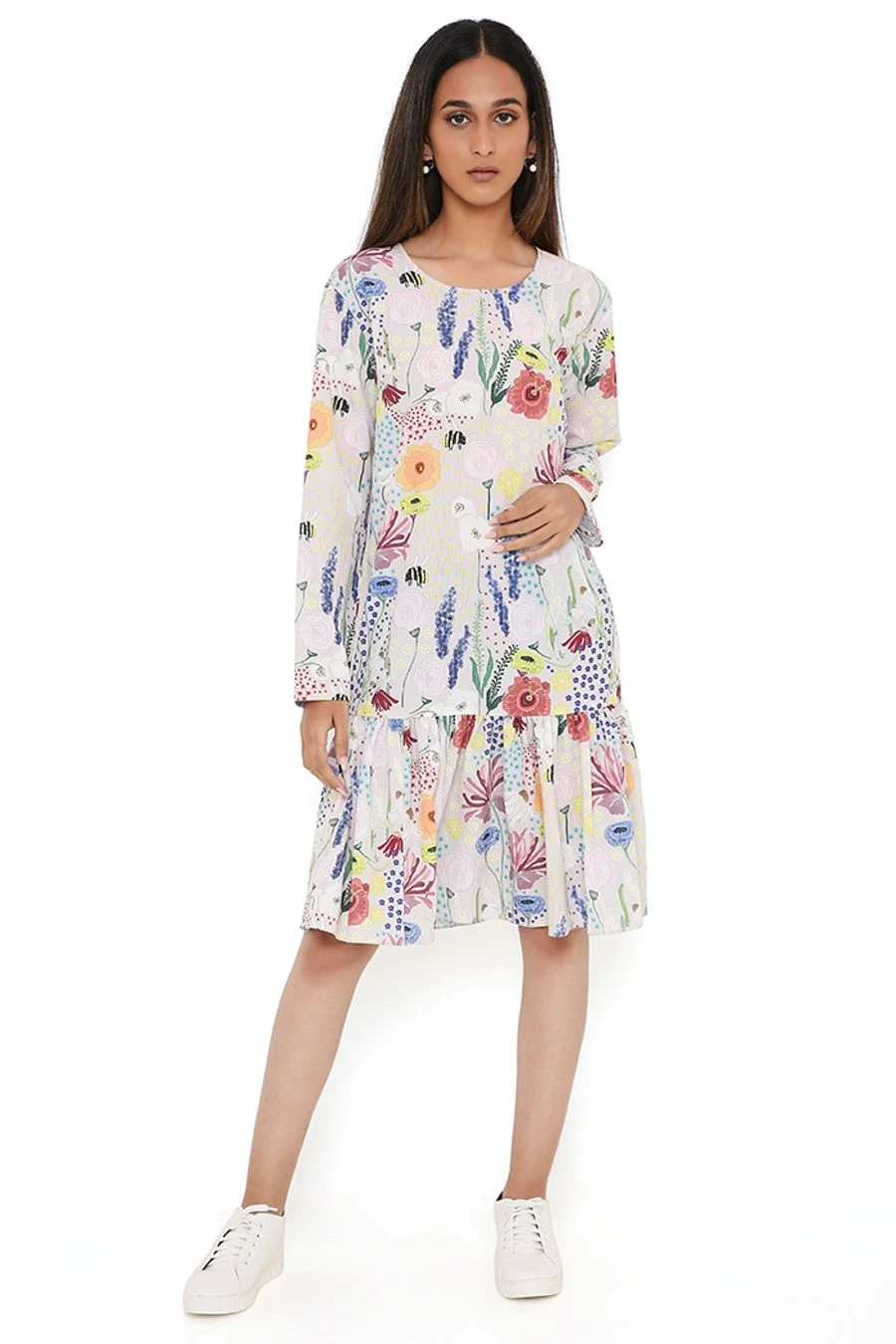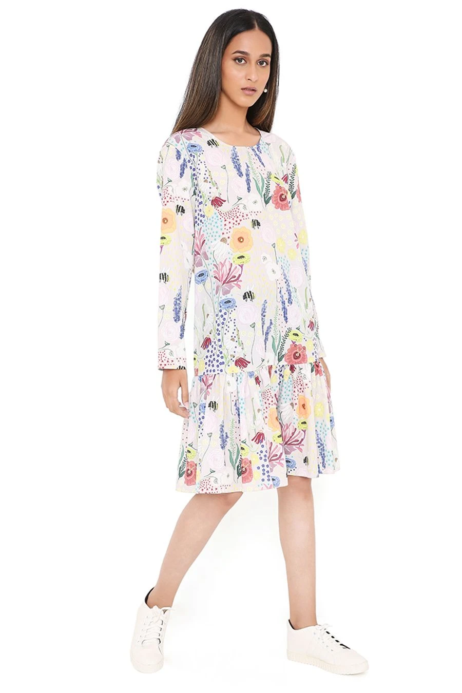 The perfect amalgamation of style and comfort, this dress is perfect for a day out. Crafted in art crepe, this dress features a floral print will a frill hem. Add a pair of dainty earrings to complete the look.