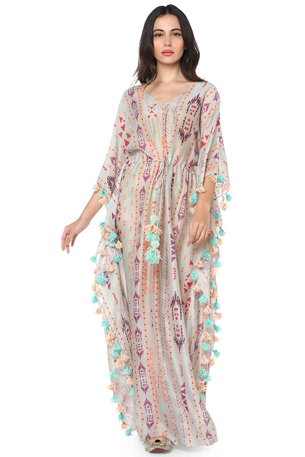 The perfect amalgamation of style & comfort, this kaftan is perfect for a day out. Crafted in silkmul, this kaftan features an ikat print & colourful tassels all over. Style it with a pair of dangler earrings to complete the look.