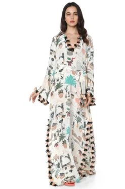 The perfect amalgamation of style & comfort, this kaftan is perfect for a day out. Crafted in silkmul, this kaftan features a Morrocan print with a high slit & colourful wool tassels. Style it with a pair of dangler earrings to complete the look.