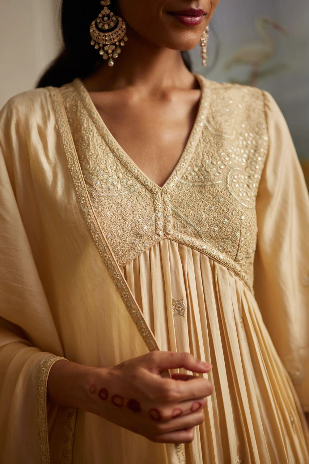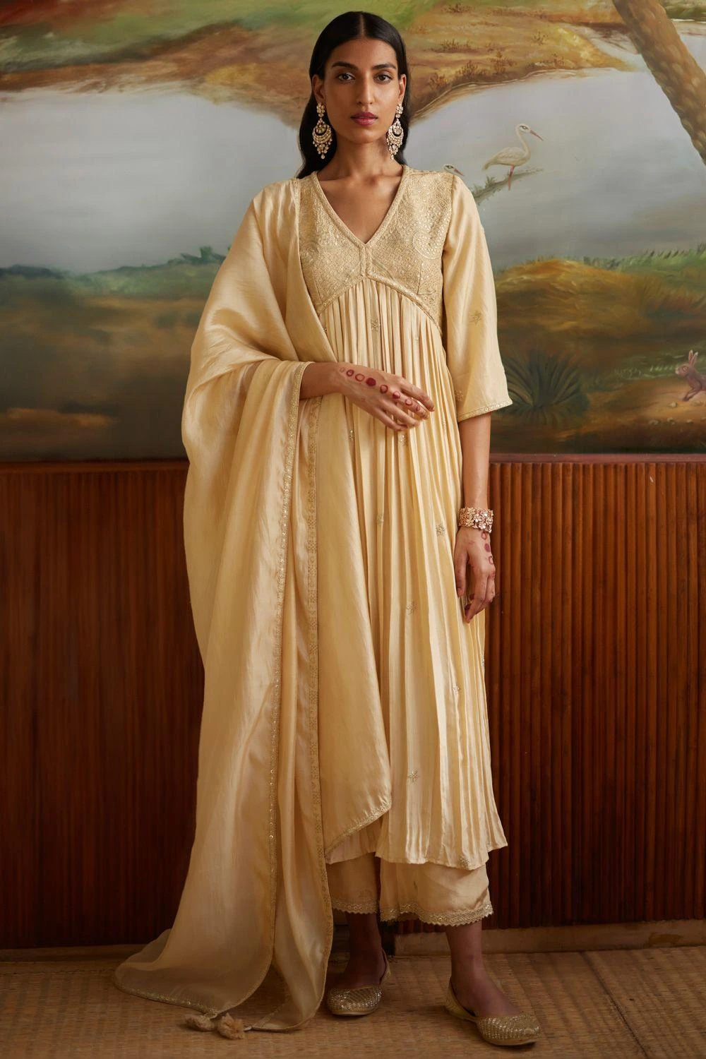 This anarkali set will see you through all kinds of celebrations this festive season. Crafted in silk, this set features a resham & coinwork anarkali paired with a coordinating dupatta & pants.