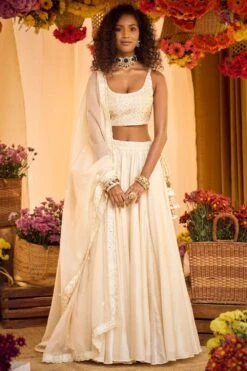 You can never go wrong with a classic ivory lehenga set at your festive occasions and this one is no exception. It features an embellished belted chanderi lehenga, paired with a resham patra & leather patch work blouse and a dupatta.