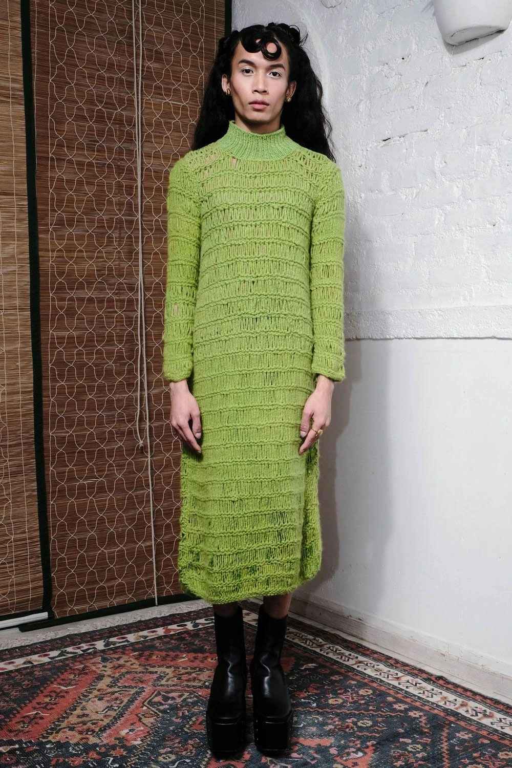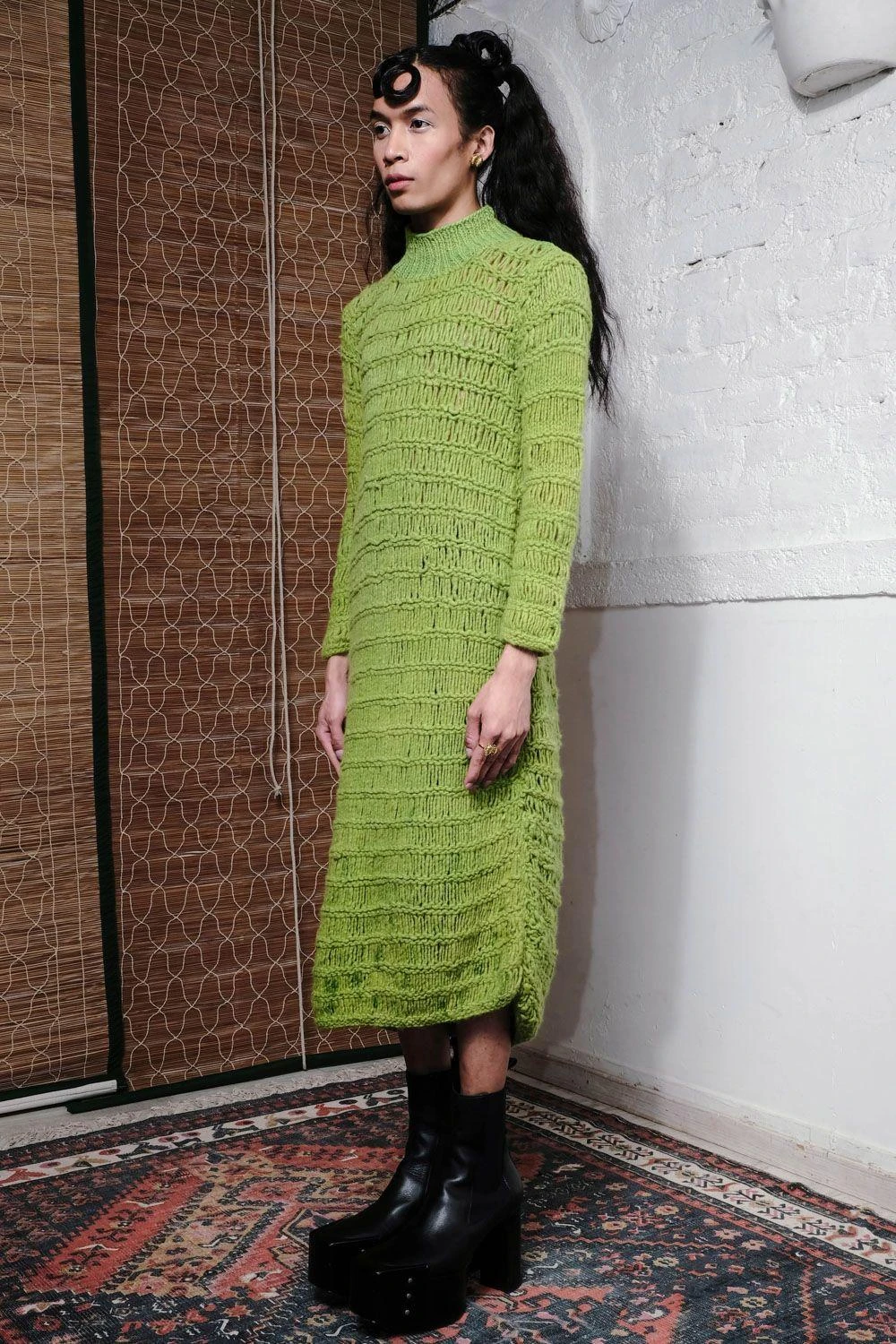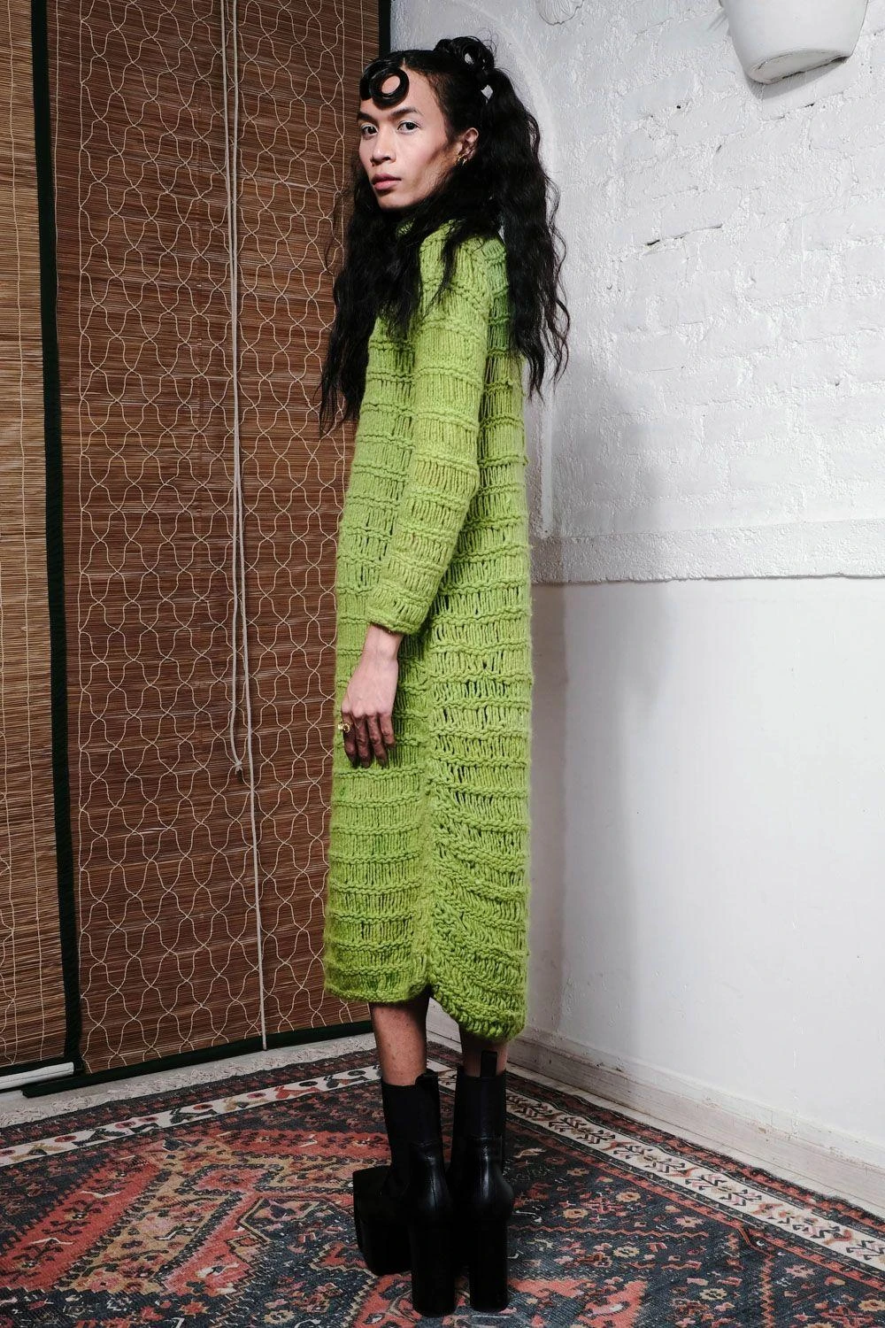Embrace bold femininity in this lime-hued, see-through hand-knitted merino wool dress with exquisite coil knit detailing. Ideal for upscale gatherings or chic evenings out, this statement piece seamlessly blends sophistication with contemporary style