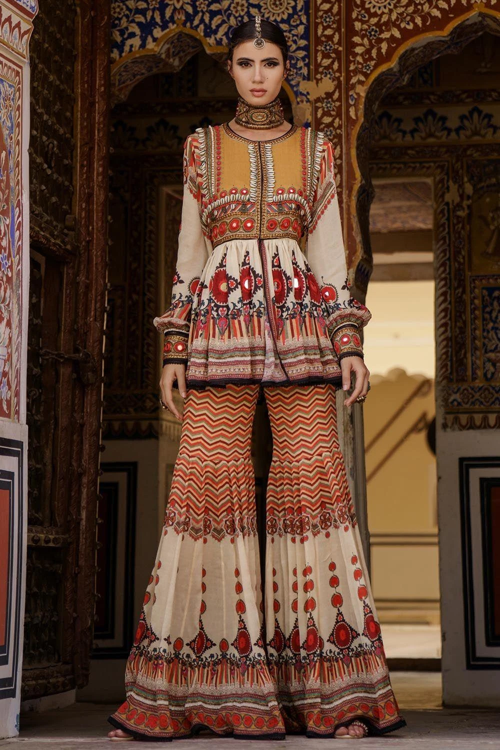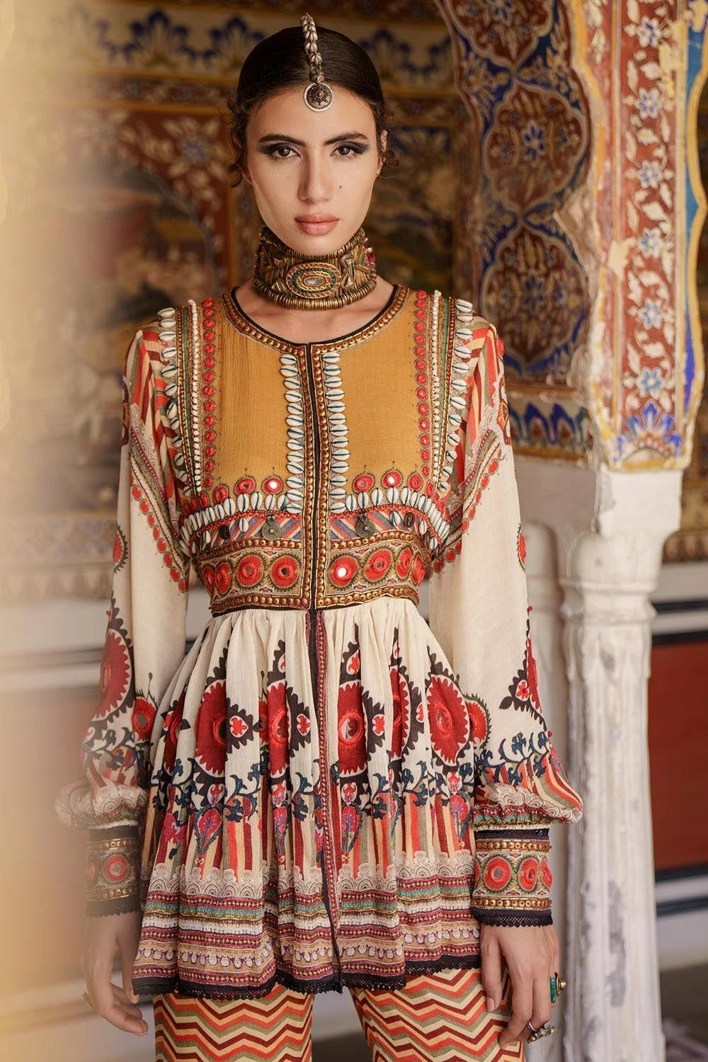 This printed bohemian tunic is set in a pure silk with a gathered top. The round neckline is embroidered in brass metal sequins, cowry shells, mirror work & antique metal coins. It is teamed up with a pair of stunning sharara with an exquisite flare.