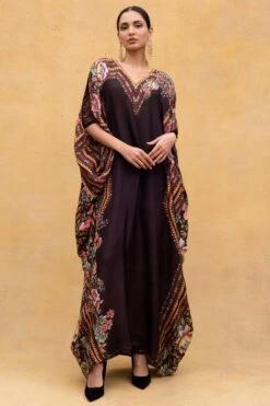This chintz silk print V neck kaftan features Kutch borders with thread fringes all along the nape of the neckline till the mid arm after the elbow. Add a pair of statement earrings to complete the look.