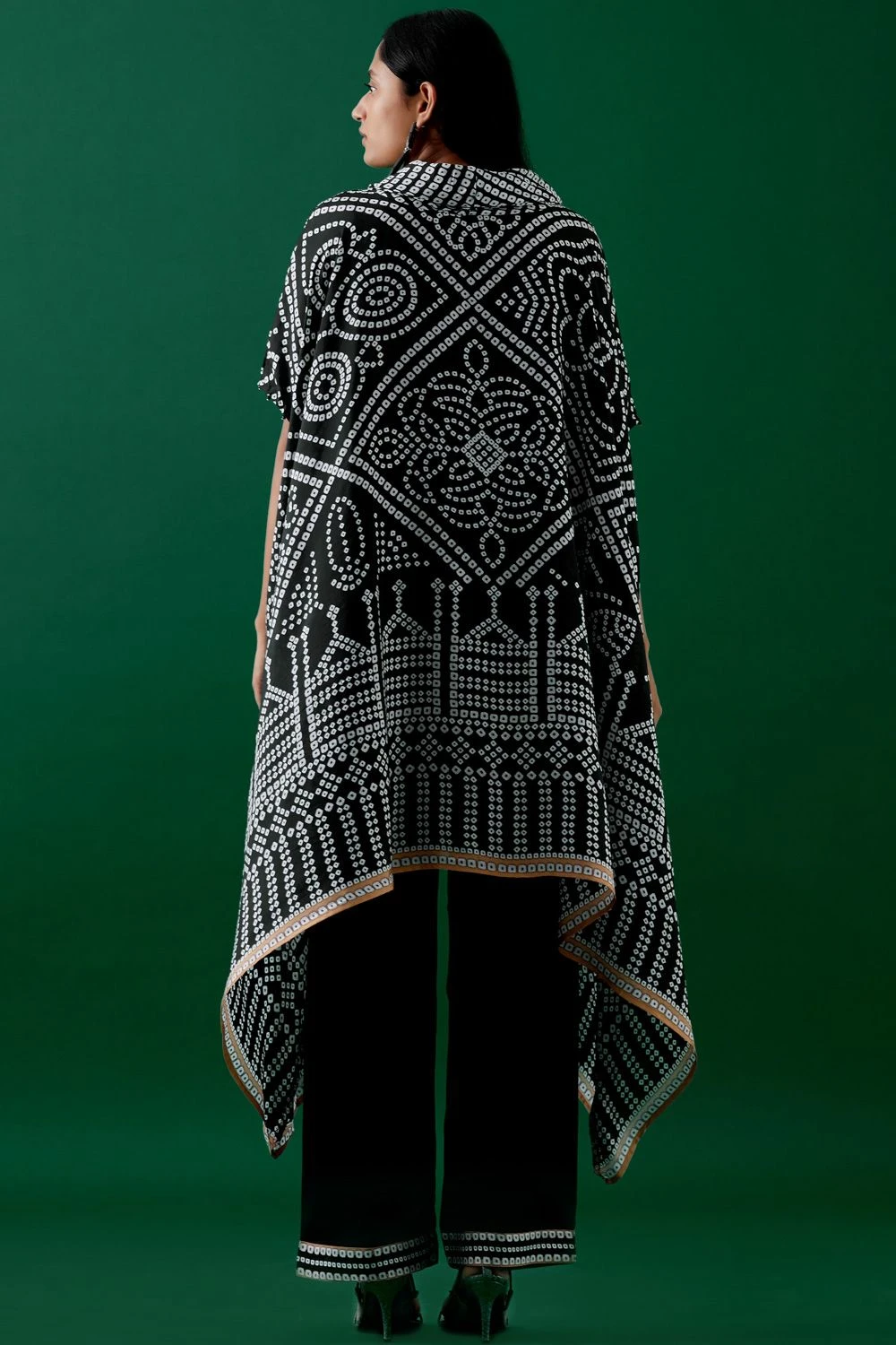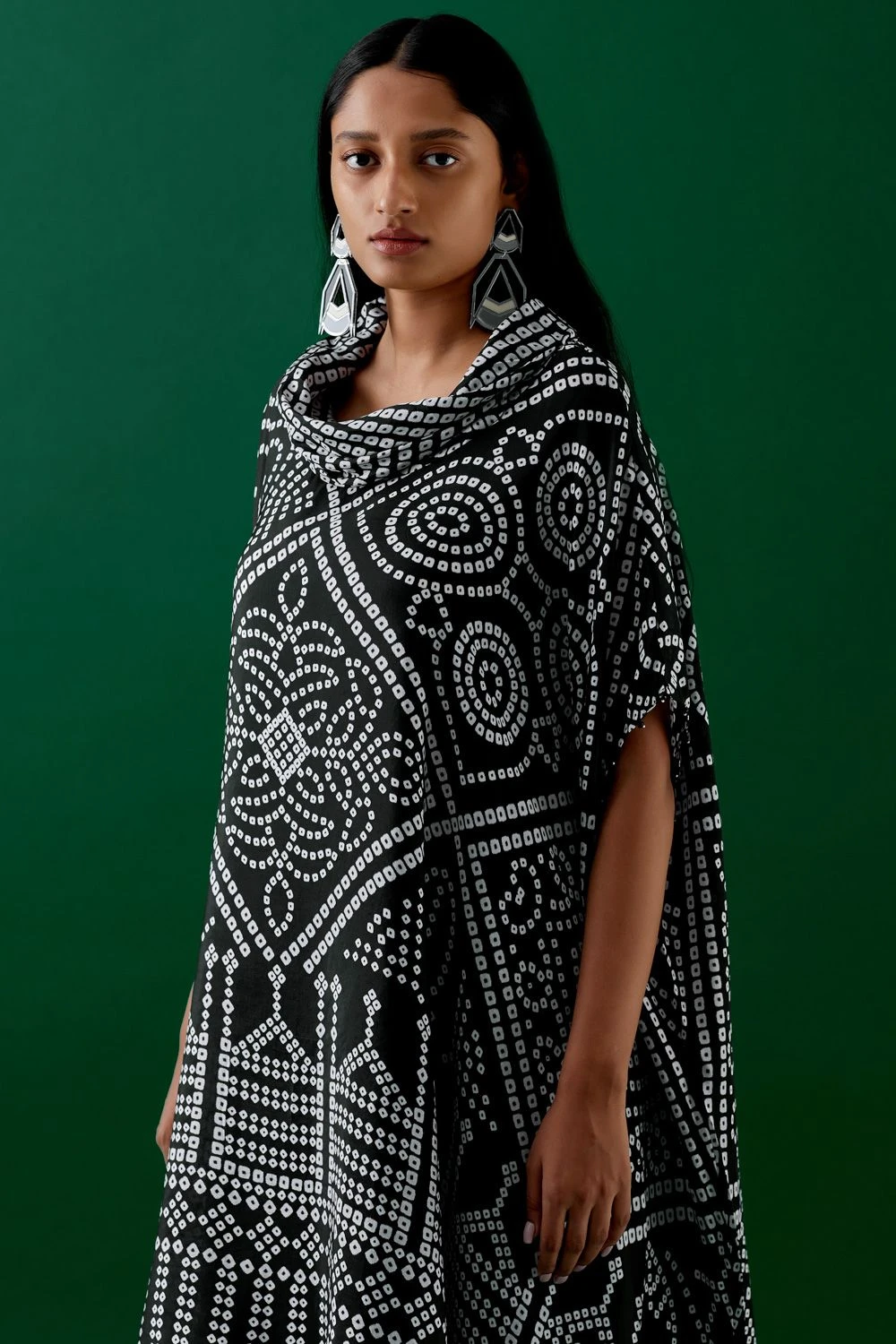 This draped monochrome tunic has drop sleeves & a cowl neckline. The tunic comes with a pair of matching printed satin pants. The draped silhouette & asymmetric hem add a graceful elegance to this one of a kind set.