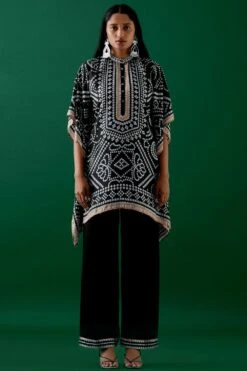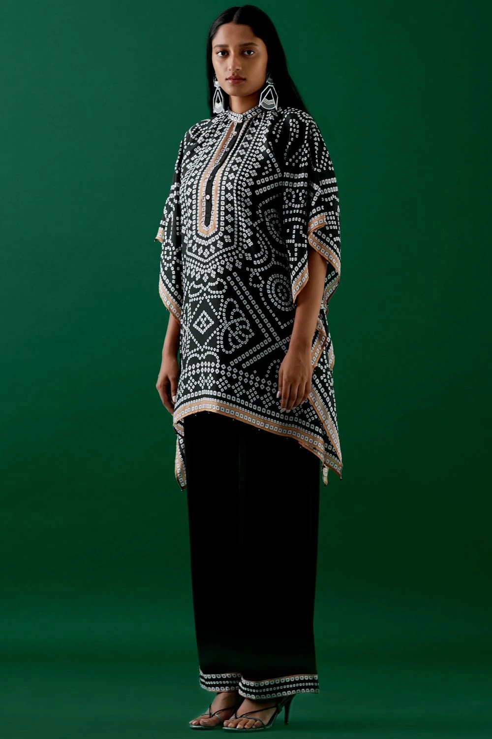 Travel but make it chic with this monochrome printed short kaftan. It is made in sumptuous silk fabric with a mandarin collar and a front button placket. You can team it up with a pair of matching pants or keep it casual with a pair of denims.