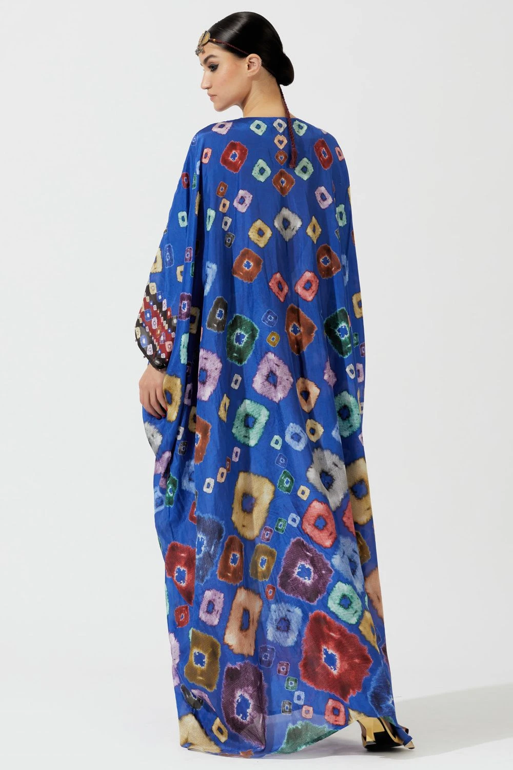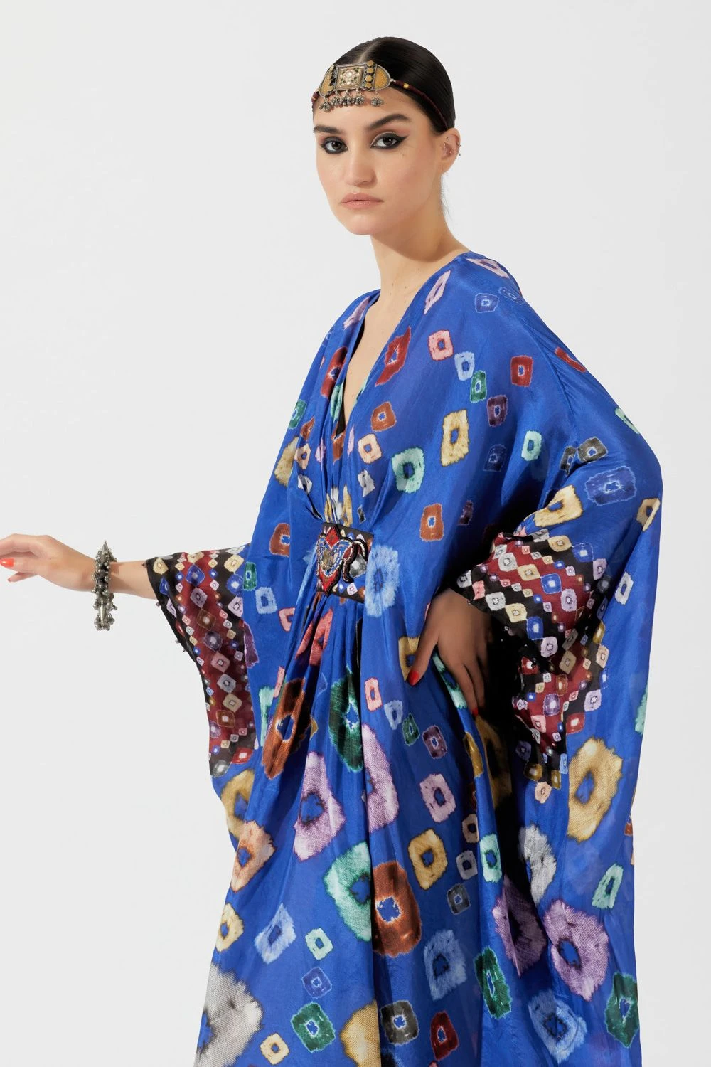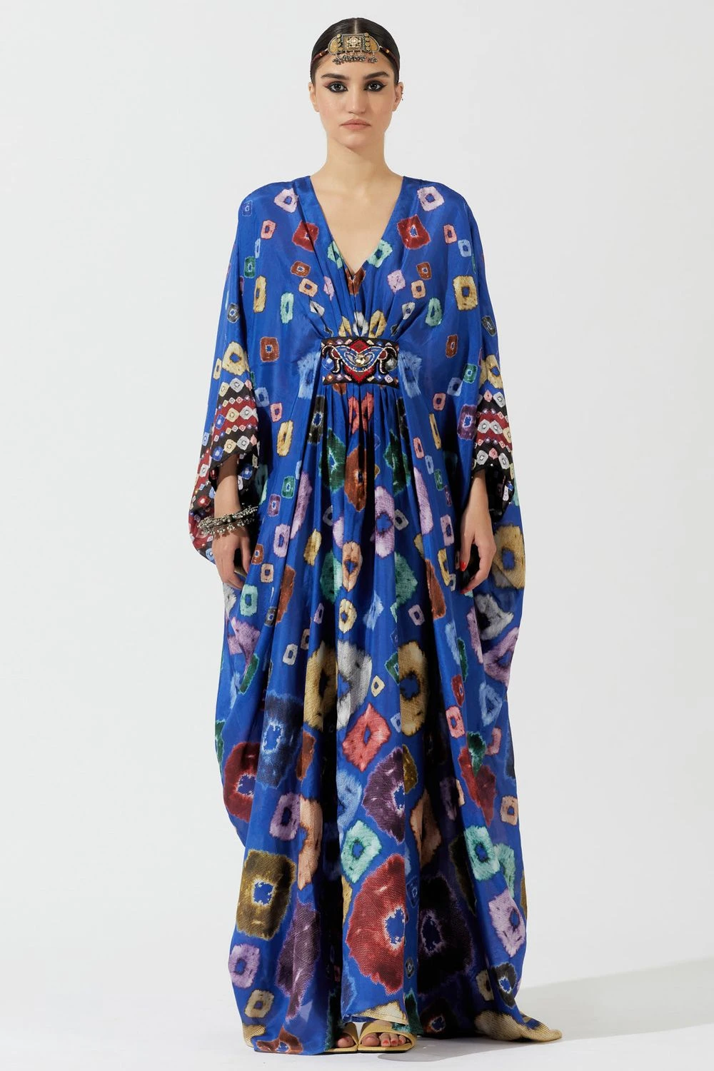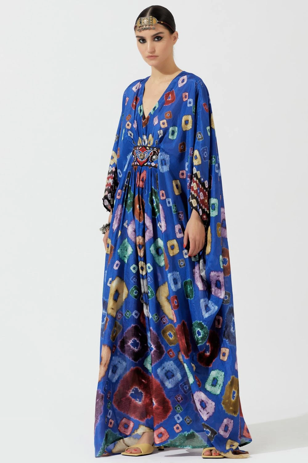 This blue printed kaftan is a perfect solution for a quick festive look. It is cut in sumptuous silk enhanced with enlarged bandhani print and a jewelled belted waist. Adorn a chic choker with this look.