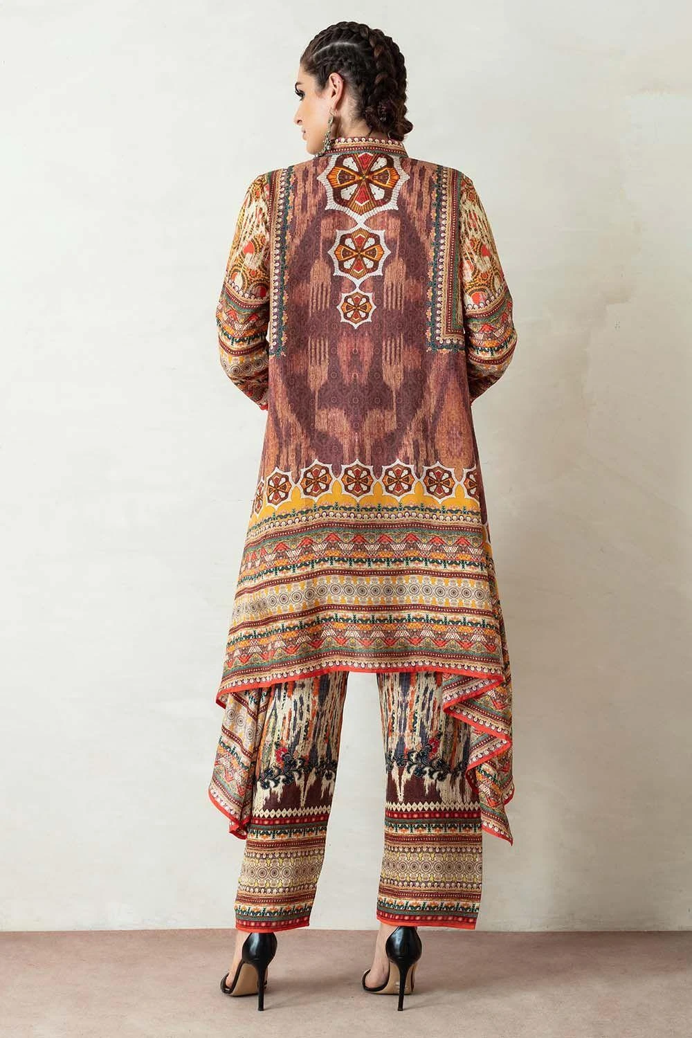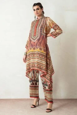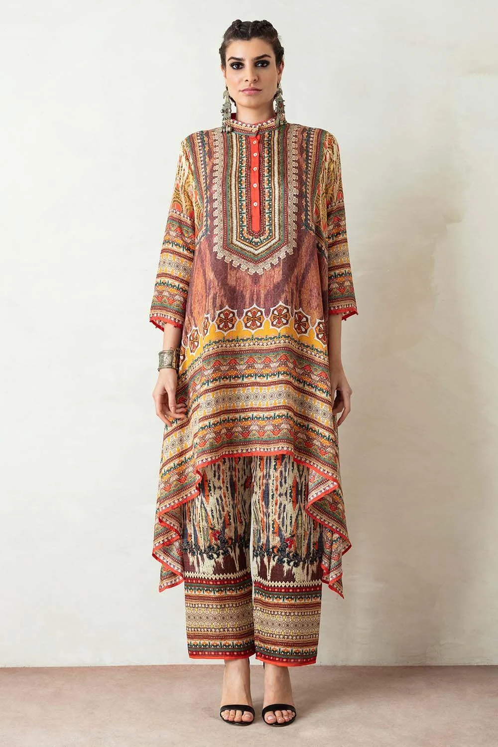 This set consists of a profusely vibrant kurta, made in luscious silk in a fluid silhouette paired with a coordinated printed palazzo pant. The kurta features asymmetric hemline and relaxed sleeves. Rendering you comfort and elegance.