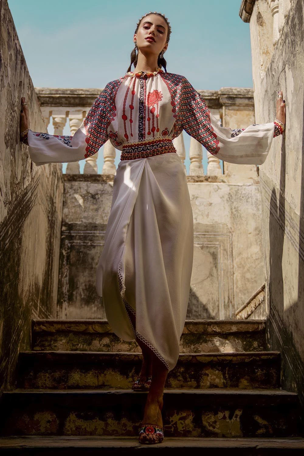 This elegant satin draped skirt has a printed & embroidered waistband. This graceful piece can be styled with the silk printed top.