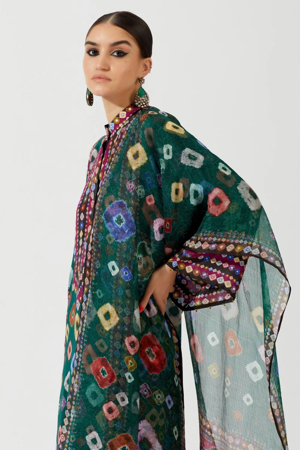 This elegant emerald green stole is set in a luxe kota silk fabric. The stole is covered in a geometric bandhani print. Style this piece with the matching set to complete the look.