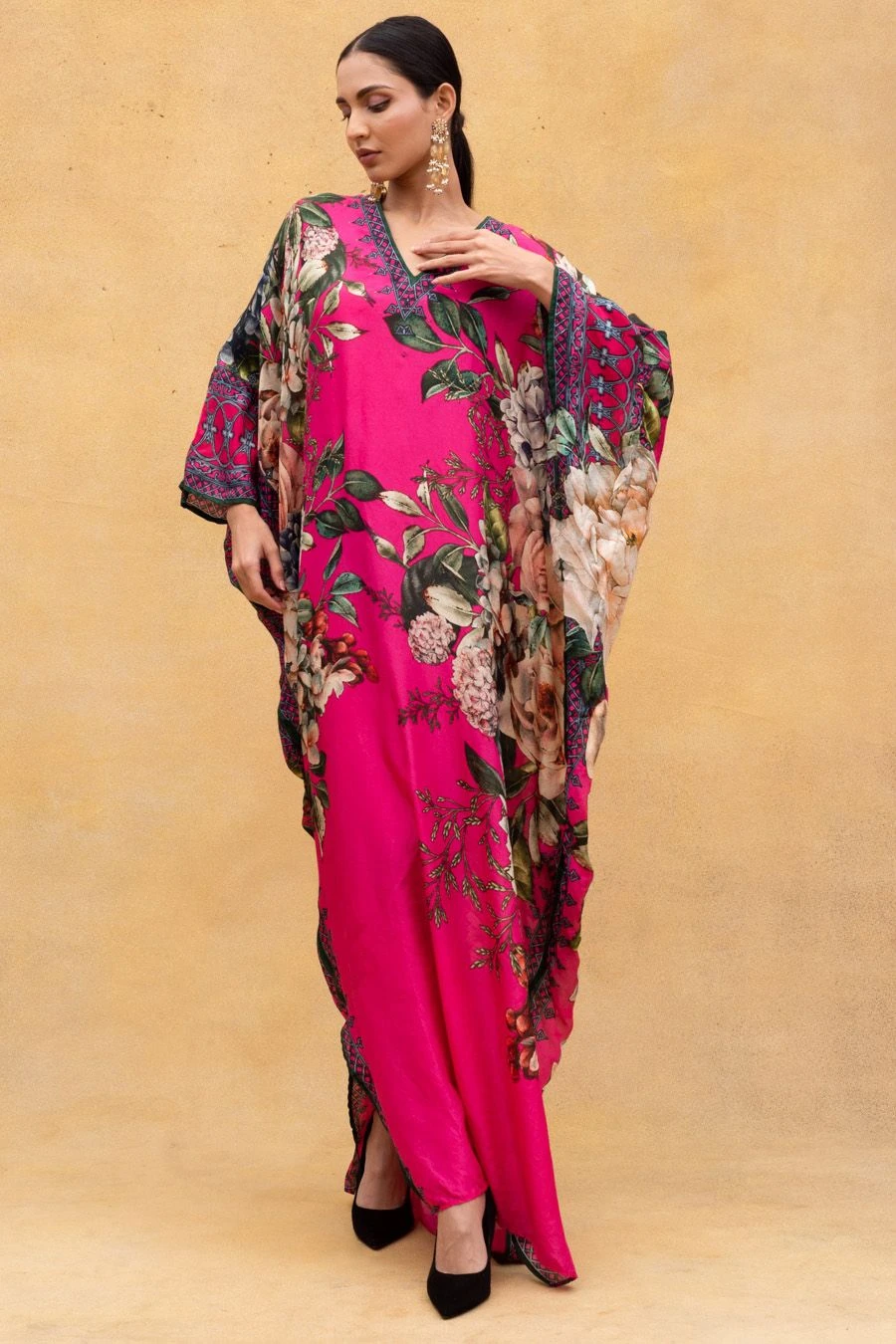 The perfect amalgamation of style and comfort, this kaftan works across occasions. This floral printed silk kaftan with a V-neckline and a narrow bottom hem comes with low side slits.