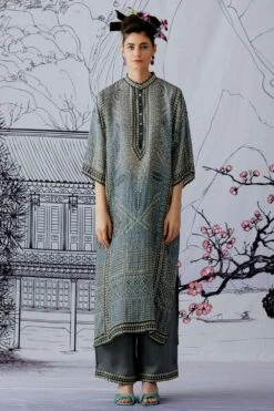 This elegant long panel kurta has a front placket & gazette sleeves. Style this elegant silk kurta with pallazos or a churidar for an effortlessly chic daytime look.