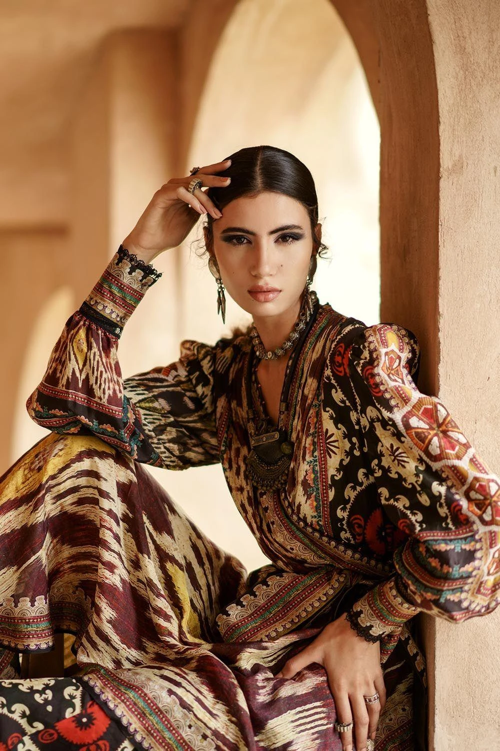 This elegant uzbek ikat & suzani printed wrap maxi dress has intricate lace details & a button closure. This stylish dress is perfect for cool autumn evenings.