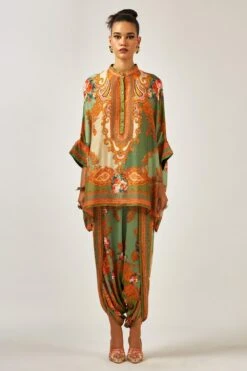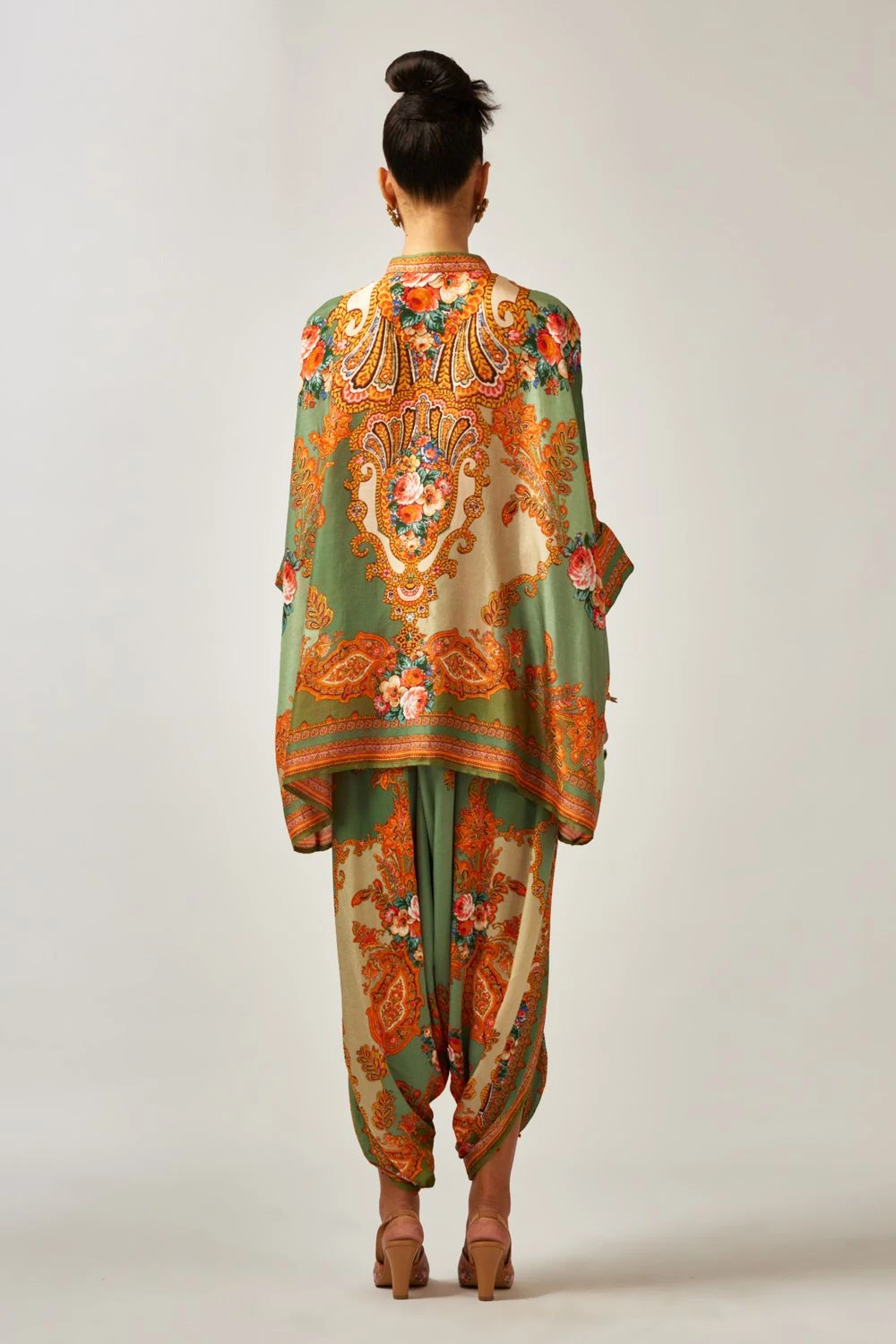 Embrace style with the green floral printed dhoti pant. Front belt and back elastic ensure comfort with a touch of elegance, a fusion of fashion and freedom for a striking ensemble.