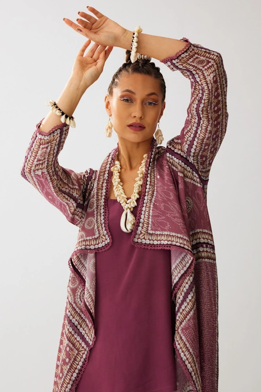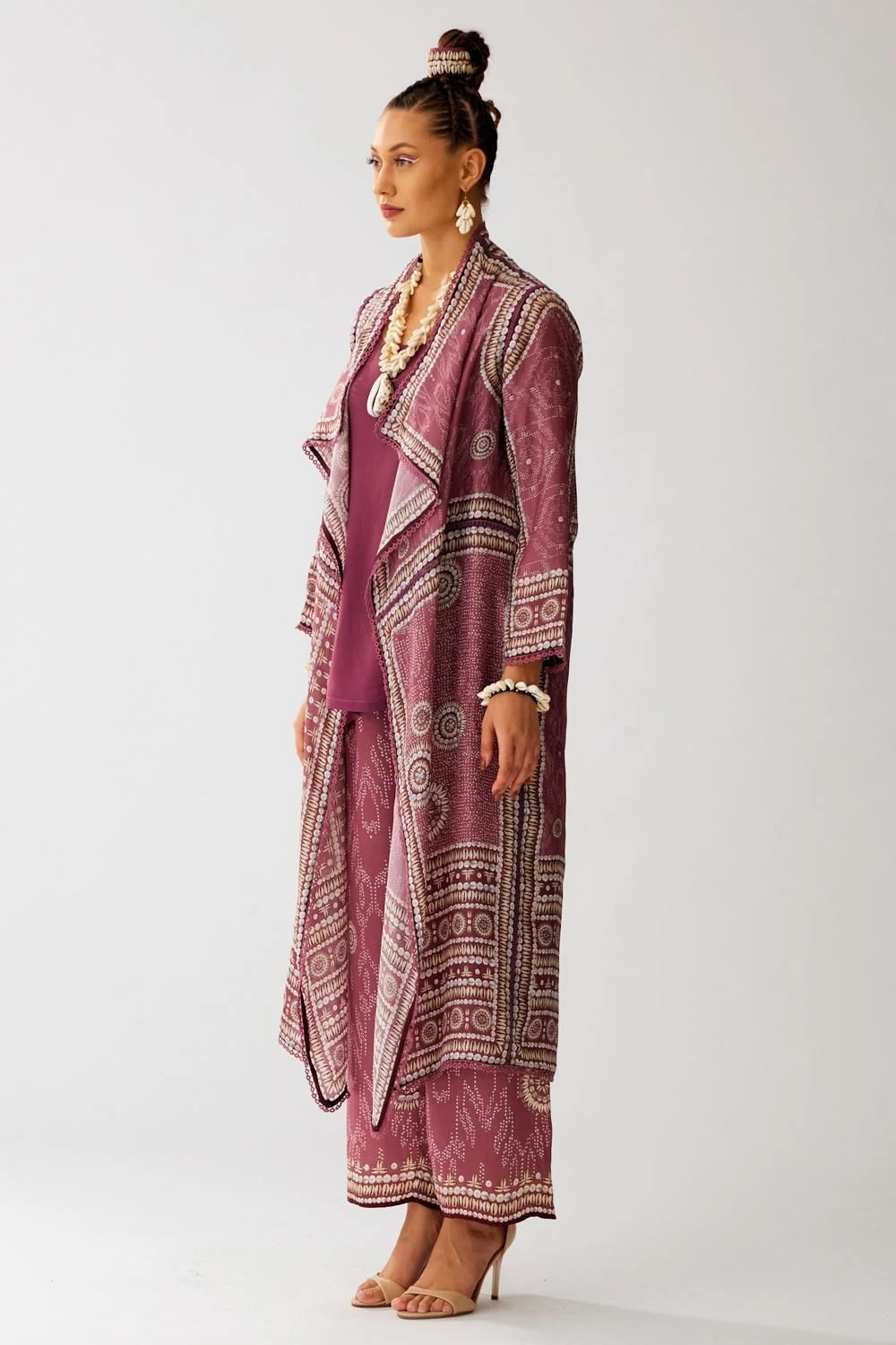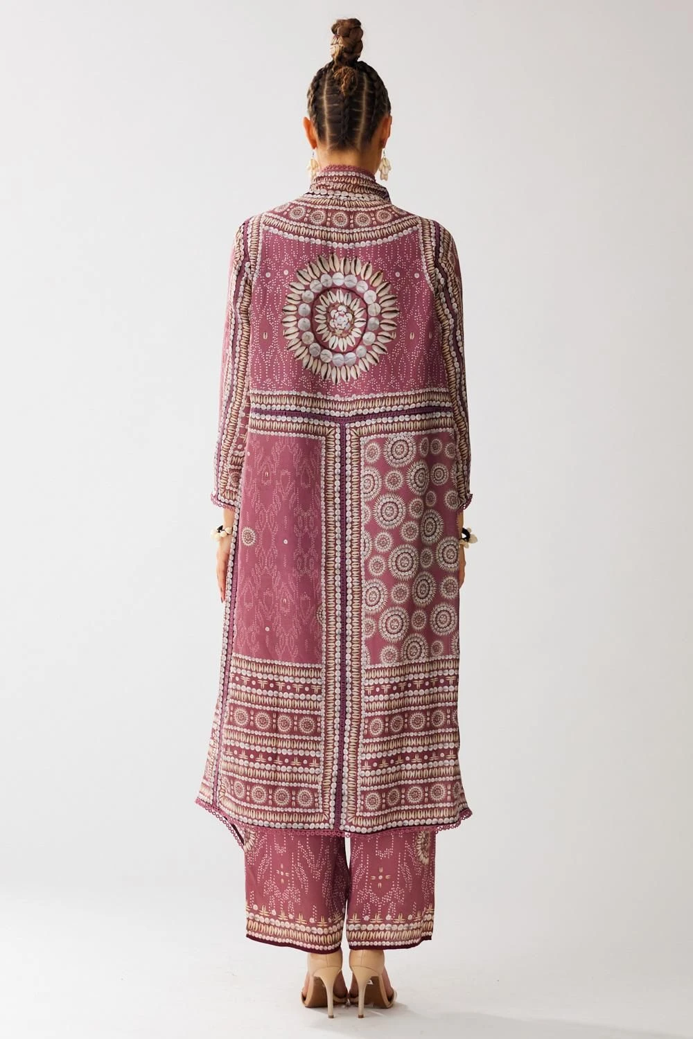 Look effortlessly stylish with this jacket. Crafted in silk, this set features a panelled jacket with block printed floral details with lace inserts & paired with a round neck top & coordinating pants.
