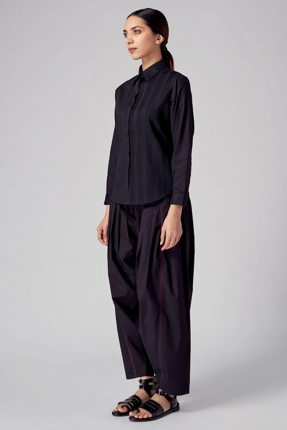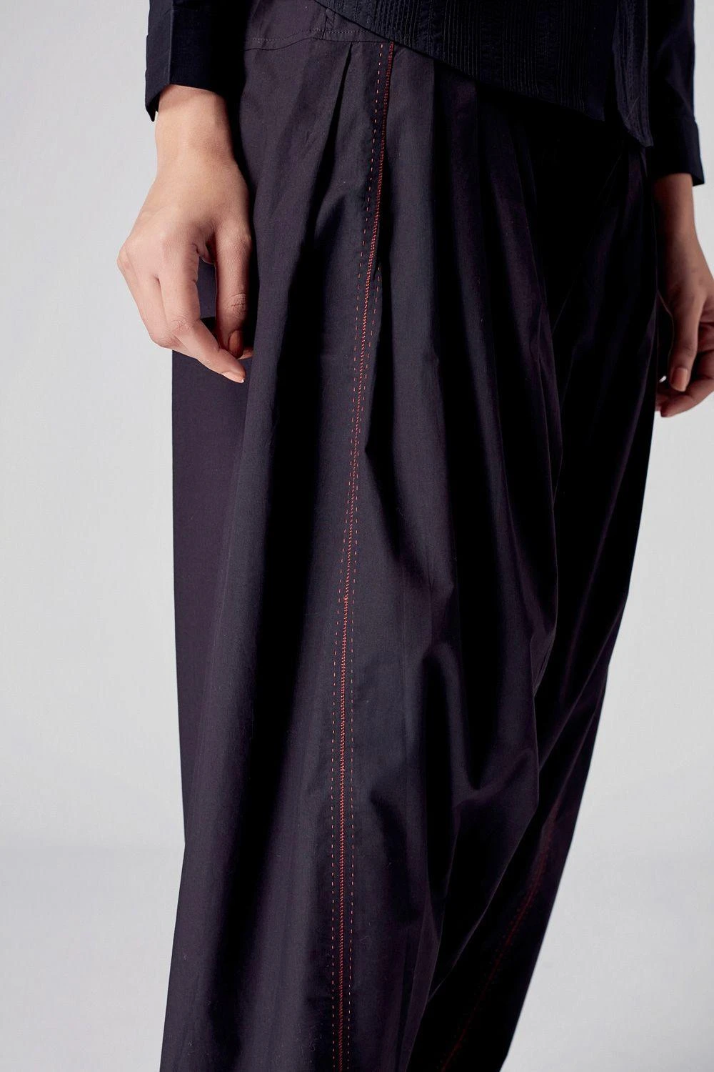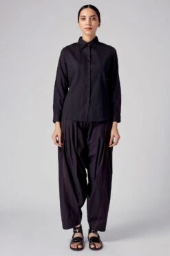 These relaxed fit black pants are a wardrobe staple piece cut in breezy cotton fabric. It features pleating detail and contrast hand stitch detailing. Team it up with a coordinating black tunic dress from the collection.