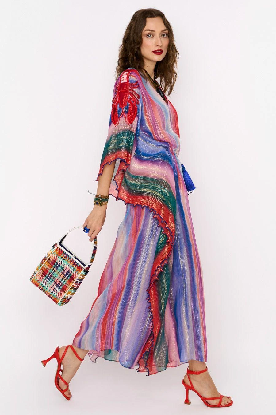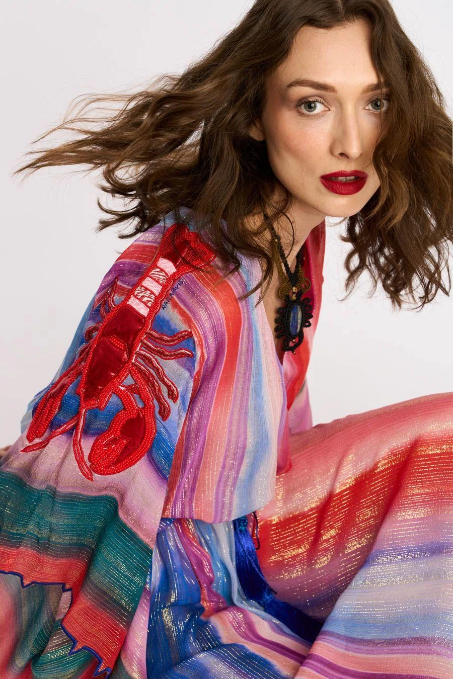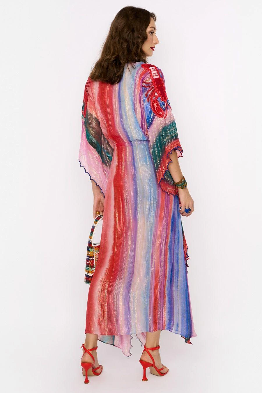 Elevate your nautical style wardrobe this summer with this one of a kind kaftan. Crafted in viscose, this rainbow, drawstring kaftan features hand embroidered lobster motifs & scalloped details. Add a pair of dangler earrings to complete the look.
