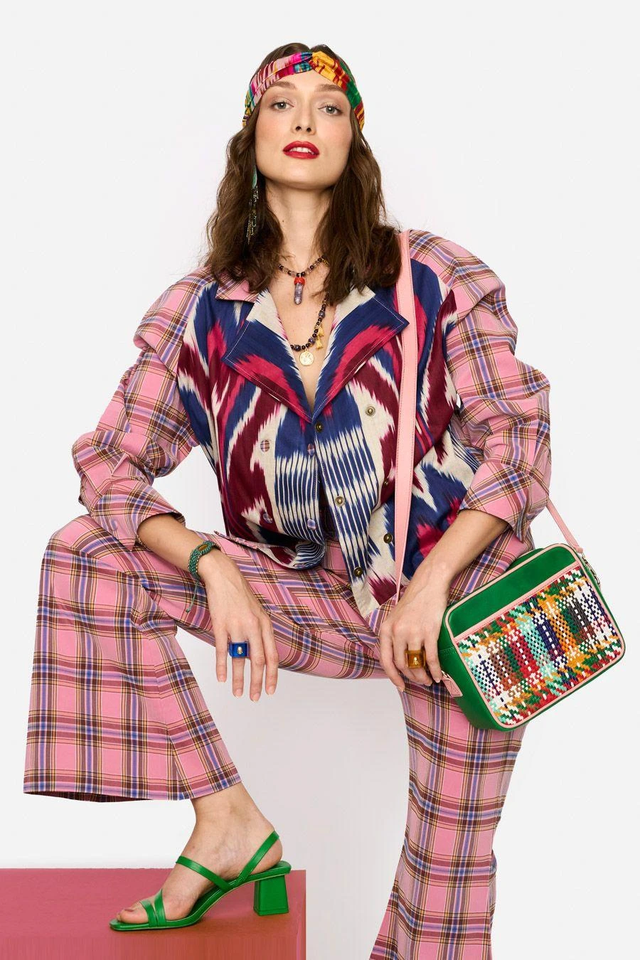 Crafted in cotton lycra, these flared pants feature a checkered print all over. Pair it with the Pink Uzbeki ikat bomber jacket from the collection to complete the set.