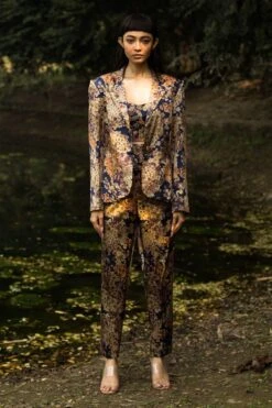 This jacket set will take you from AM to PM in no time. Crafted in satin, this set features a botanical printed blazer and trousers paired with a bustier. Style it with statement earrings & a stack of bracelets to complete the look.