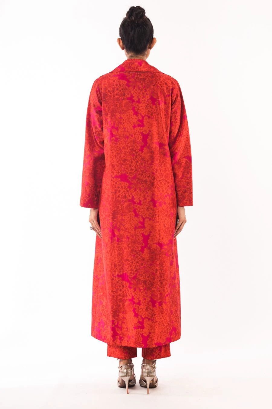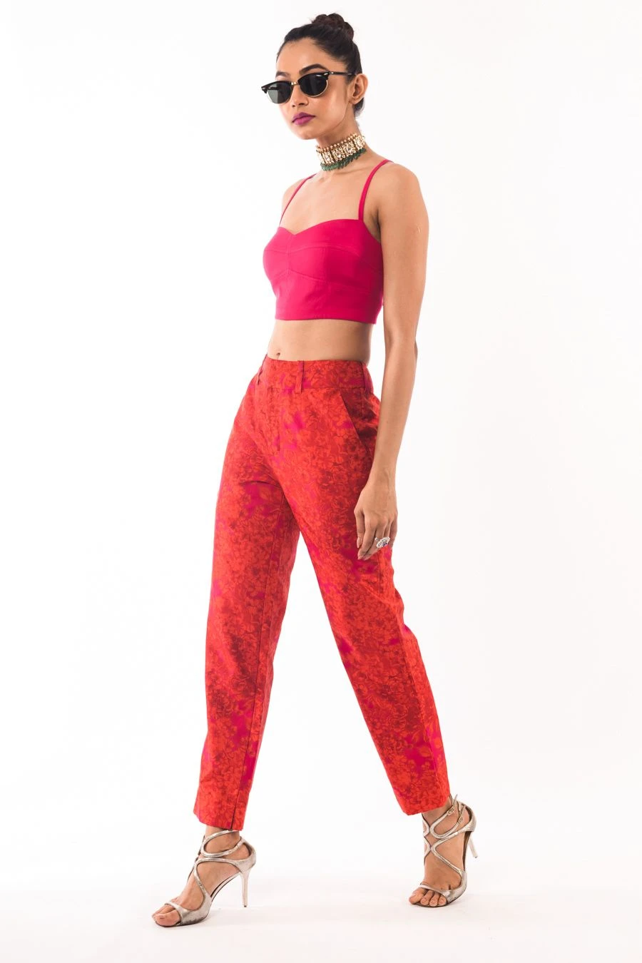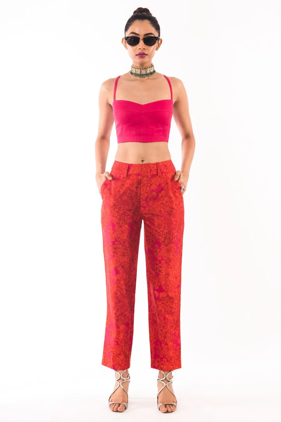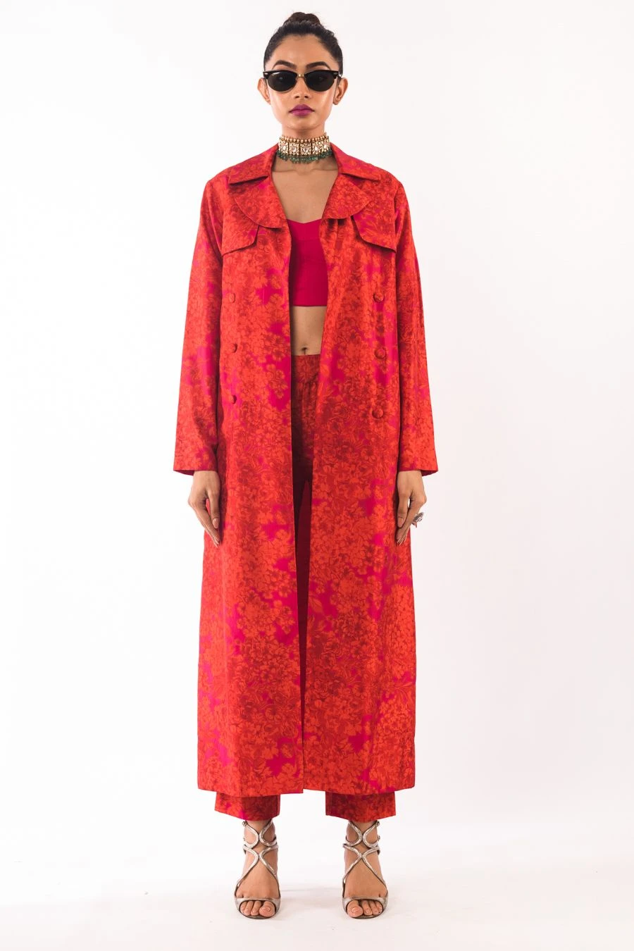 This jacket set falls in the realm of luxe minimalism. Crafted in silk, this set features a printed trench coat paired with a bustier and straight fit pants. Add a pair of statement earrings to complete the look.