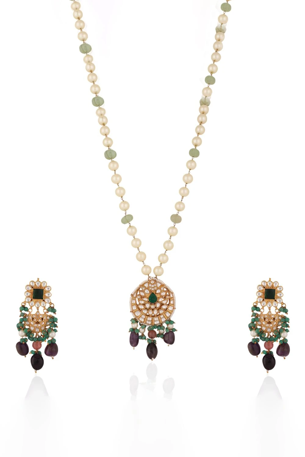 Embrace opulence with the Divine Pearl & Purple Jade Adorned Necklace Set, accentuated by lustrous emerald beads and kundan stones. This statement piece, paired with matching earrings, exudes sophistication and timeless allure.