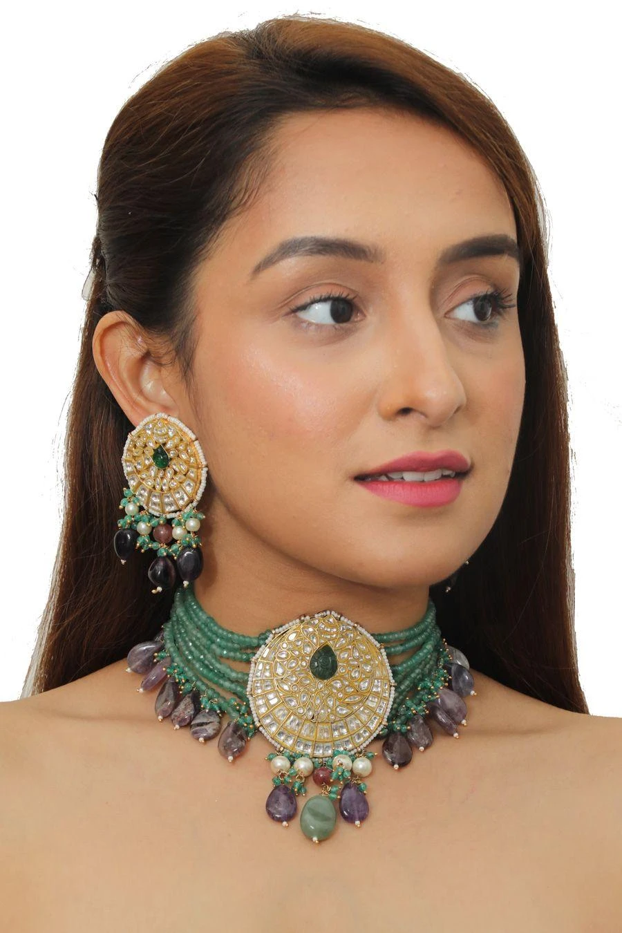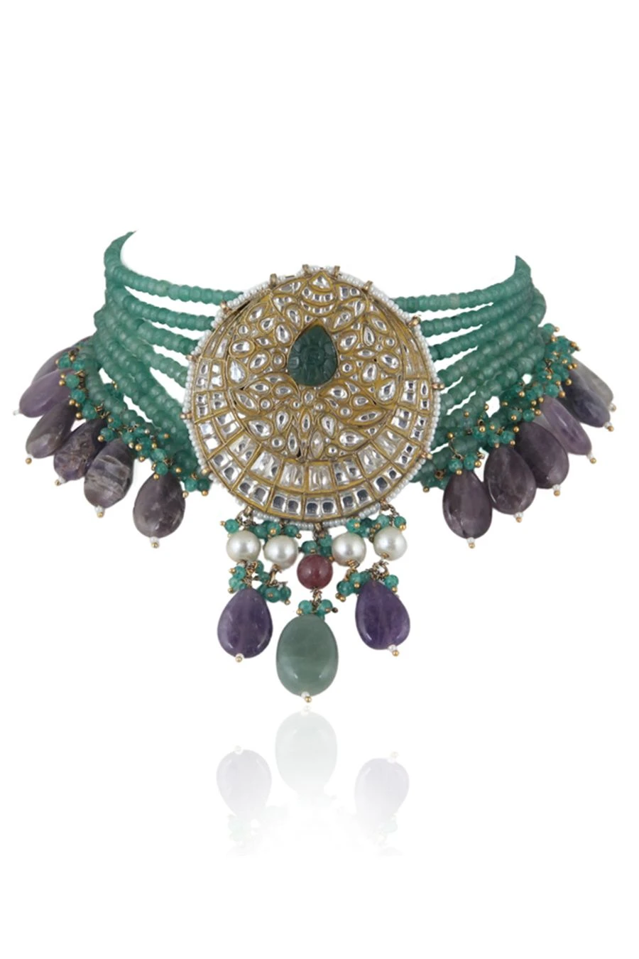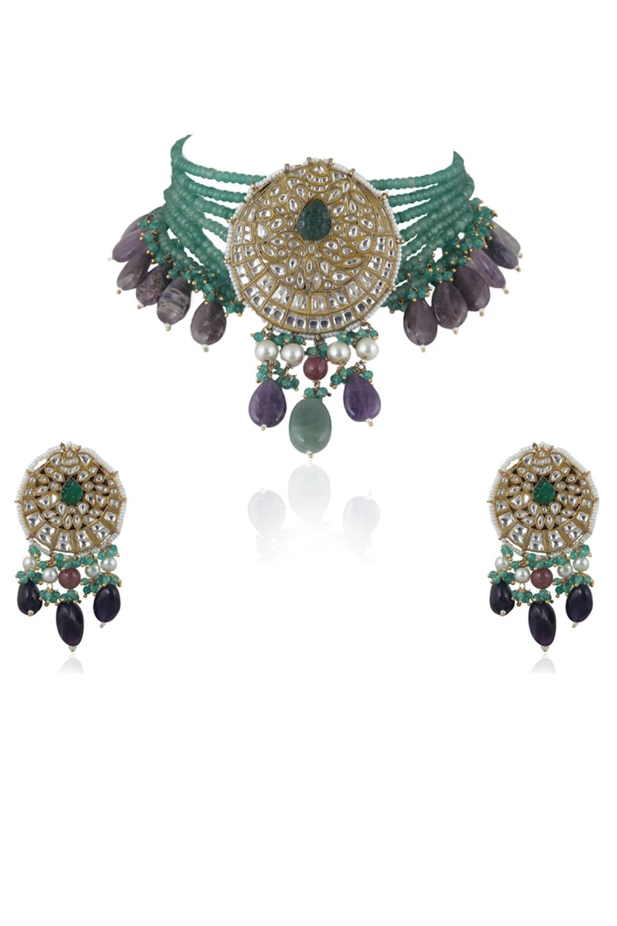 Accentuate your festive looks with this green necklace set. Crafted in a silver & copper mix, this set comes with a jadtar necklace with intricate beadwork paired with matching earrings. Style it with an anarkali or lehenga to complete the look.