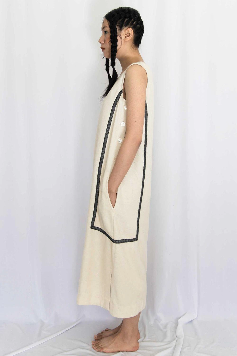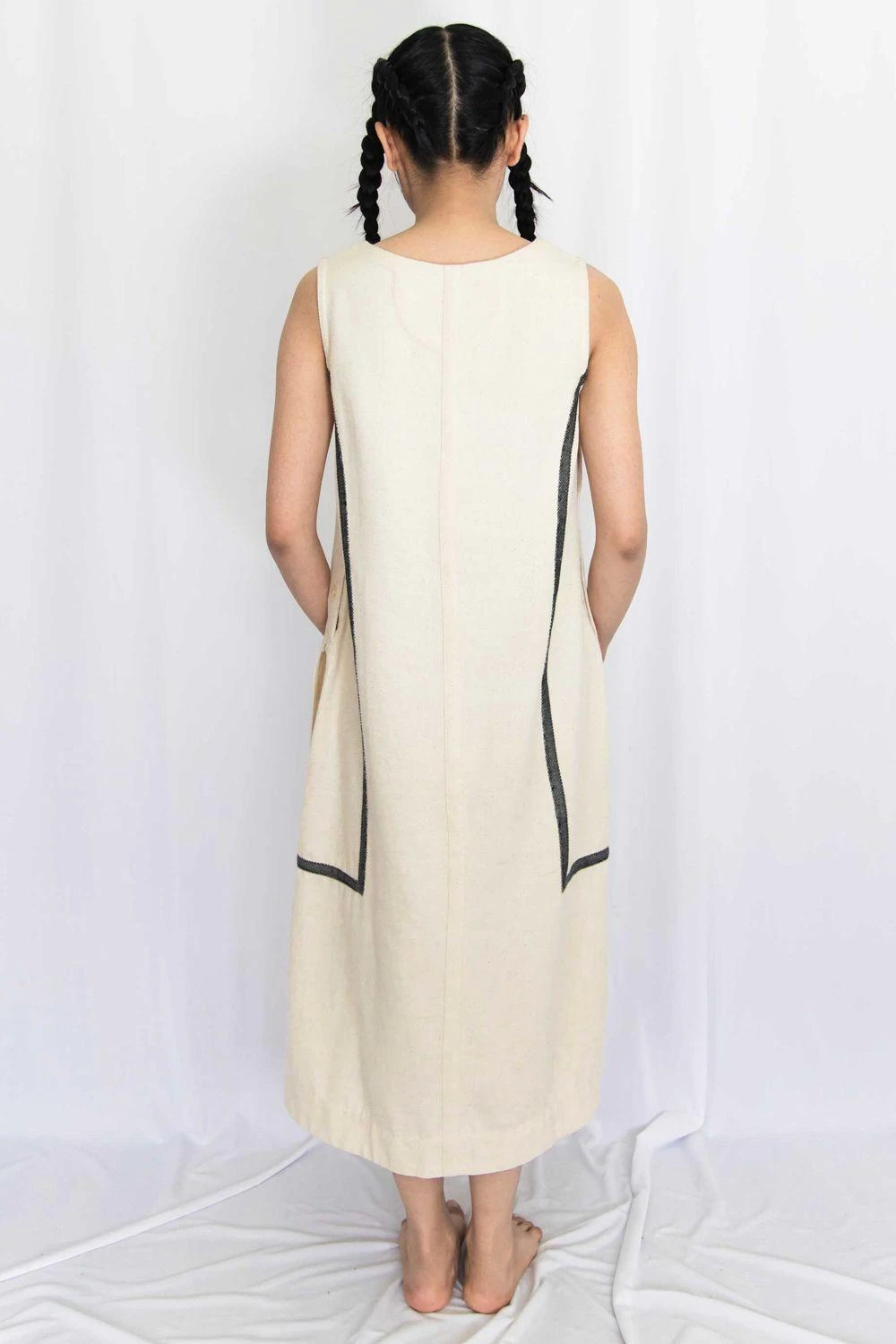 Home or away, this ecru relaxed fit dress is the ideal wardrobe staple. It is woven in indigenous handspun handwoven cotton denim fabric and features side button details with slits, adding comfort to the look. Dress it up with a pair of chic flats.