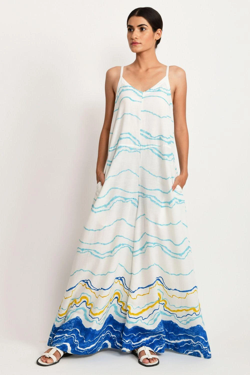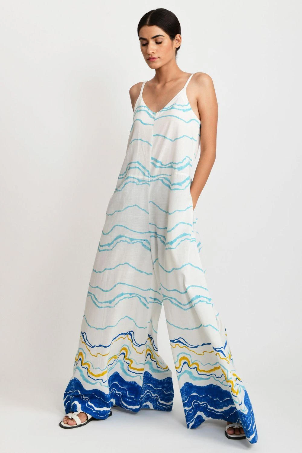 Cleanse your holiday closet with this breezy & light wave print jumpsuit. It is cut in indigenous cotton, blended with natural bamboo yarn and enhanced with handblock prints. Dress up your look with a boho clutch and layered necklace.