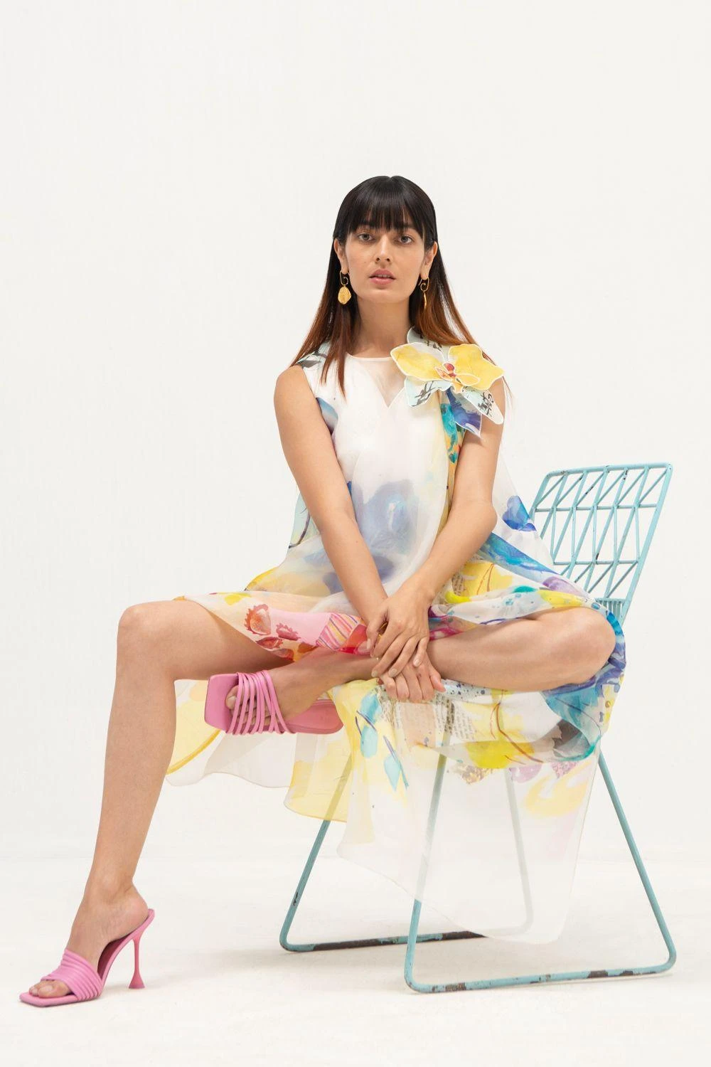 Embark on a journey of radiant beauty with this Orchid dress, gracefully layered over a scuba inner dress. Allow the vibrant hues to envelop you in a captivating kaleidoscope of elegance.