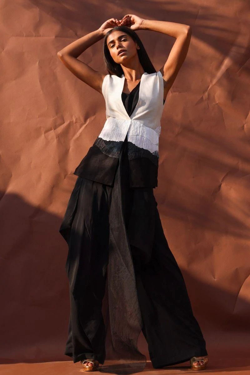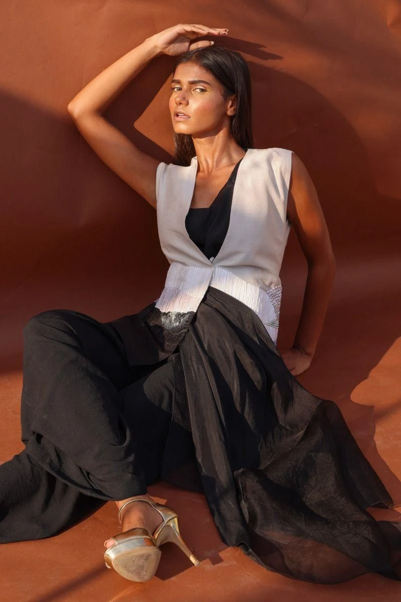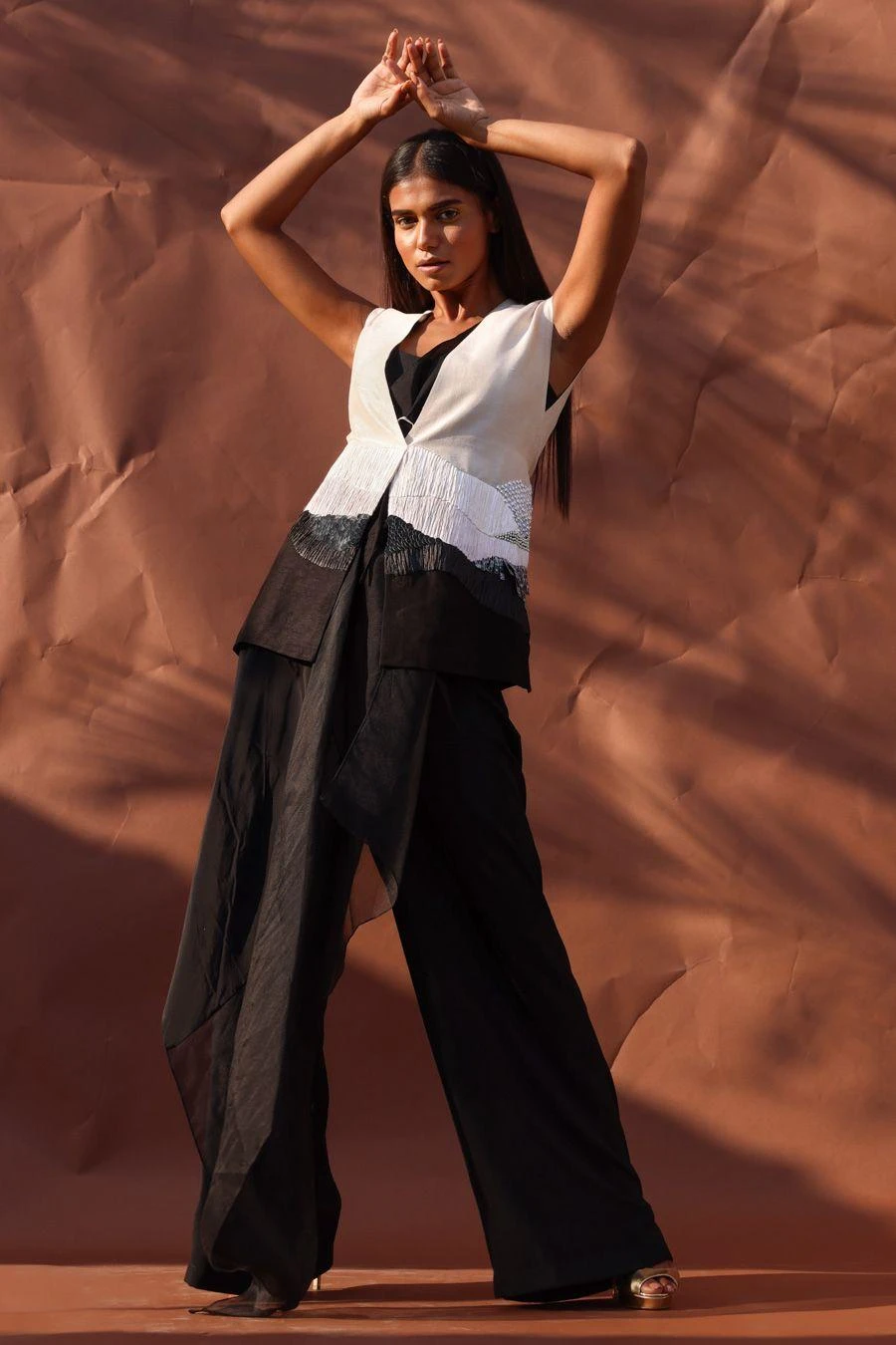 If you’re looking for a head-turning statement-making pant set, this is the outfit for you. Crafted in silk and taffeta, this set features a black rafia gilet, an inner with panels and georgette twill pants.