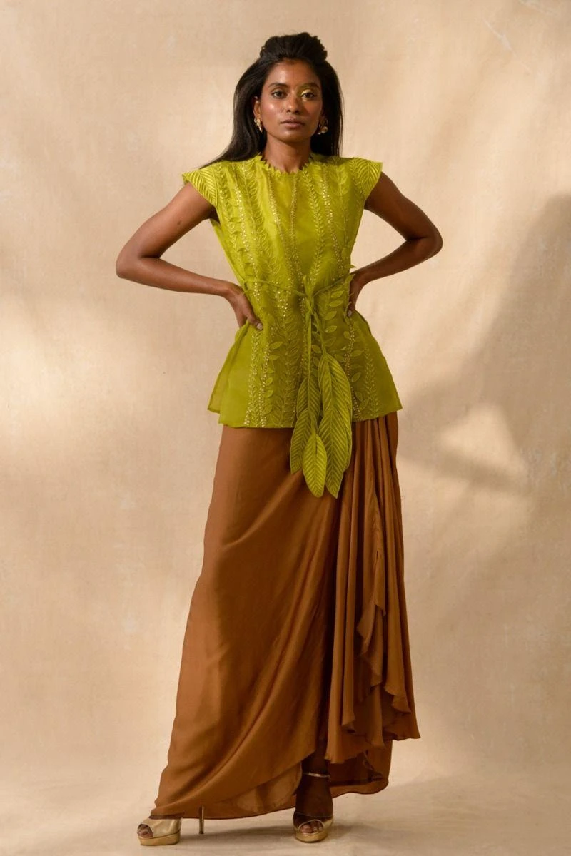 Add a layer of glamour and statement to your resort getaways with this co-ord set. Crafted in satin, this set features a floral embellished cape paired with a draped skirt. Add a pair of dangler earrings to complete the look.