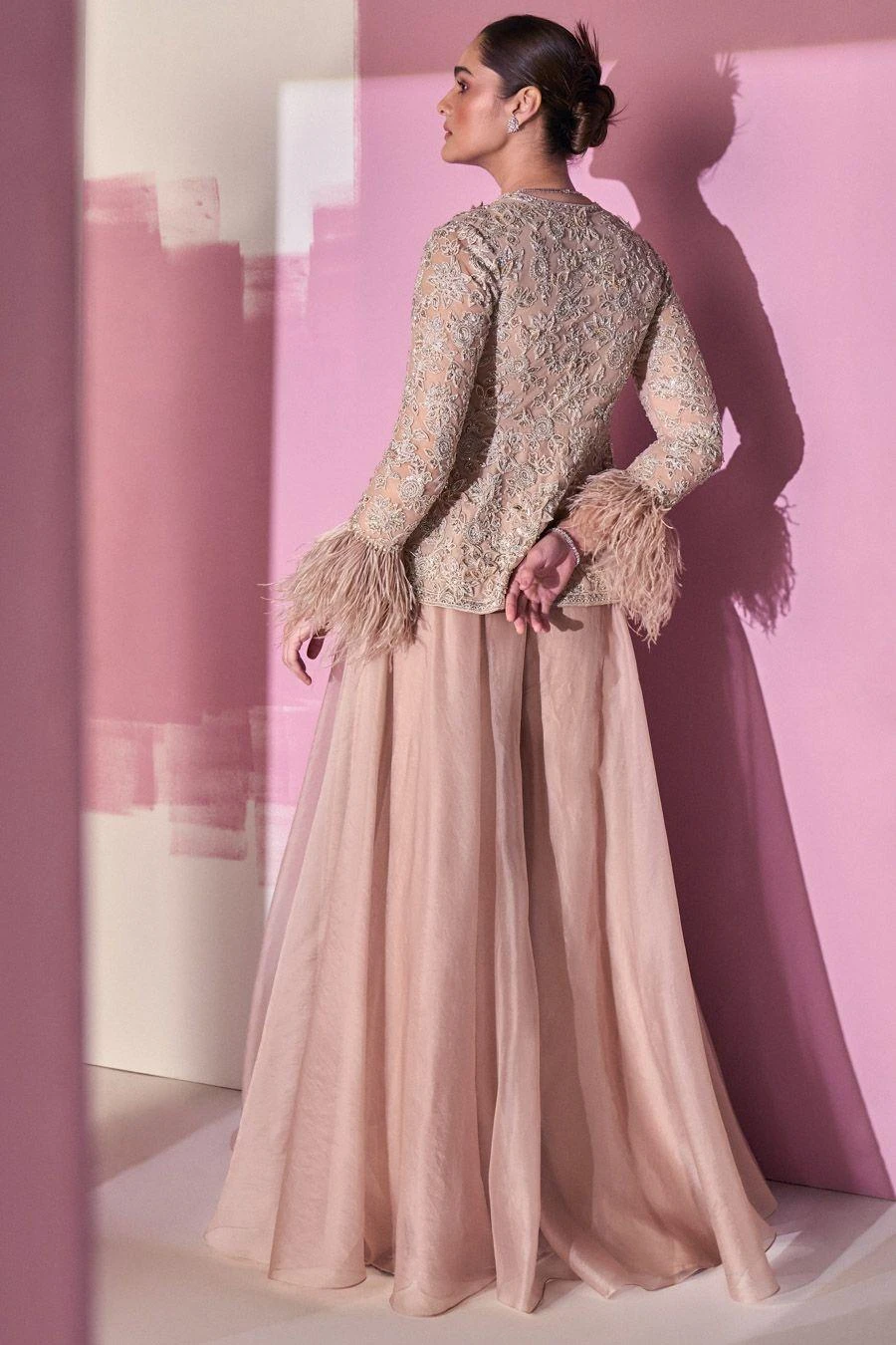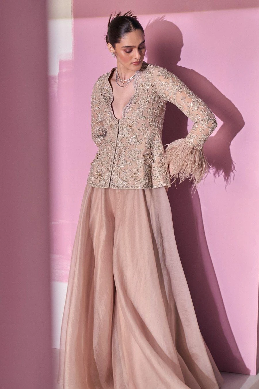 Indulge in luxury with this embroidered peplum featuring feathers on the cuff, paired with a flared organza sharara. The intricate embroidery and exquisite design make it a perfect choice for any special occasion.