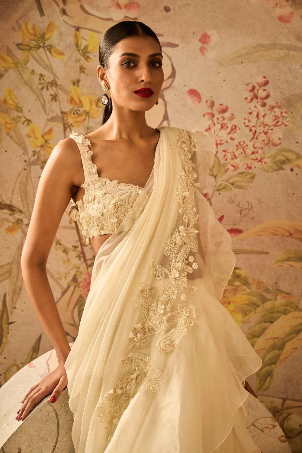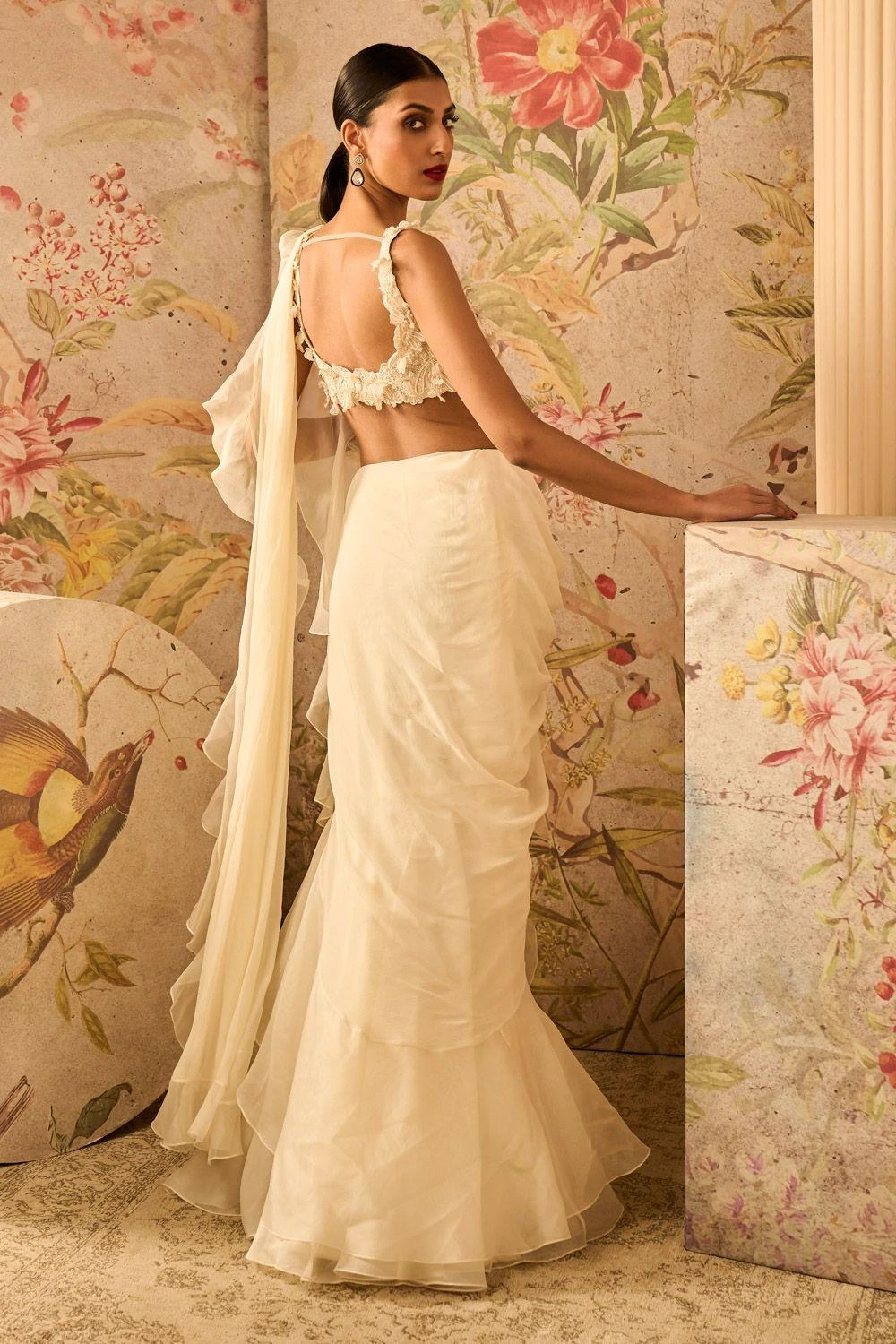 Drape yourself in sheer elegance with this embroidered blouse paired with a chiffon drape sari. The exquisite embroidery on the blouse adds a touch of opulence, while the organza ruffles detailing on the sari creates a mesmerizing flow.