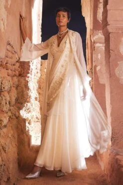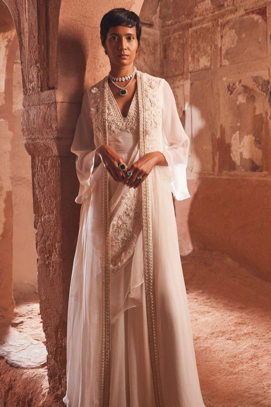 Uncomplicated & fuss-free, this ivory jacket set is a great pick for a reception. Crafted in net & organza, this set features a heavily embellished jacket paired with a jumpsuit and a drape.